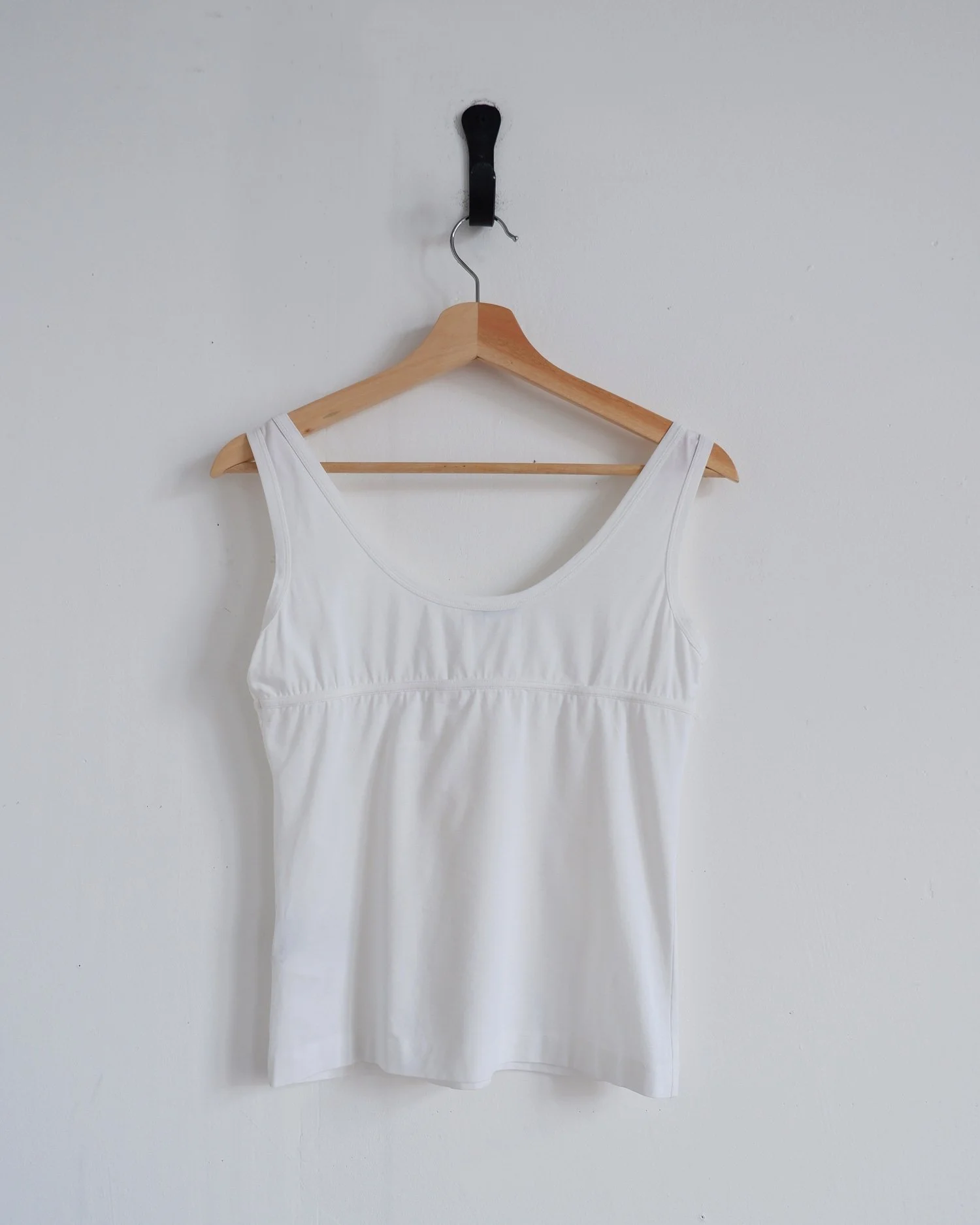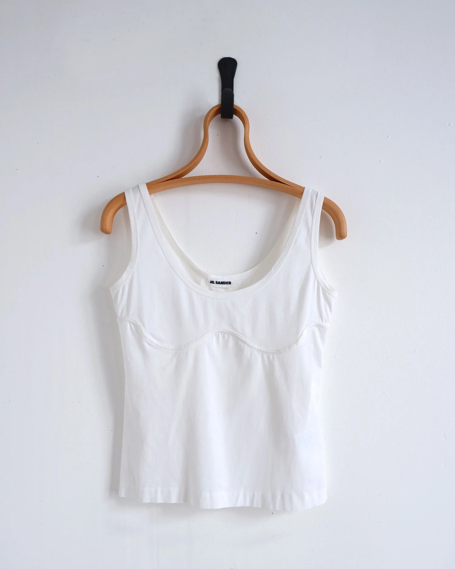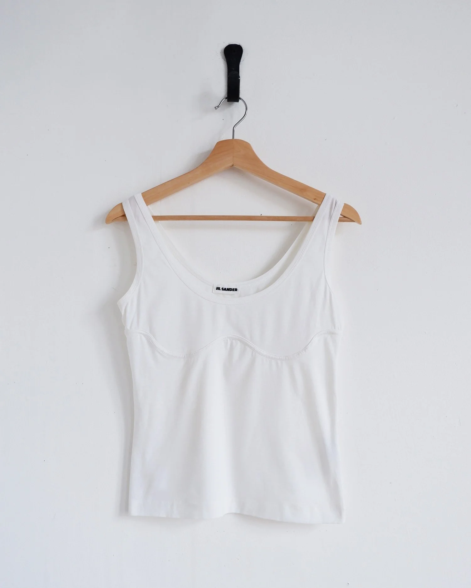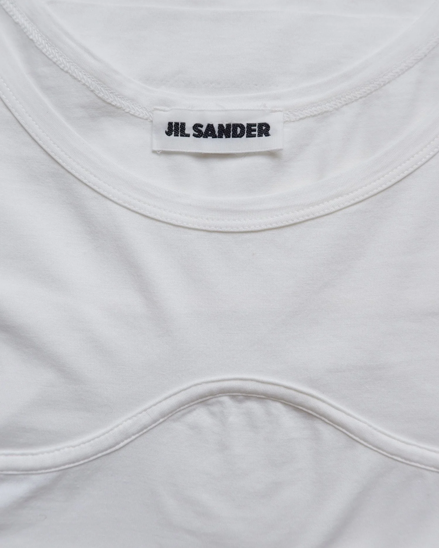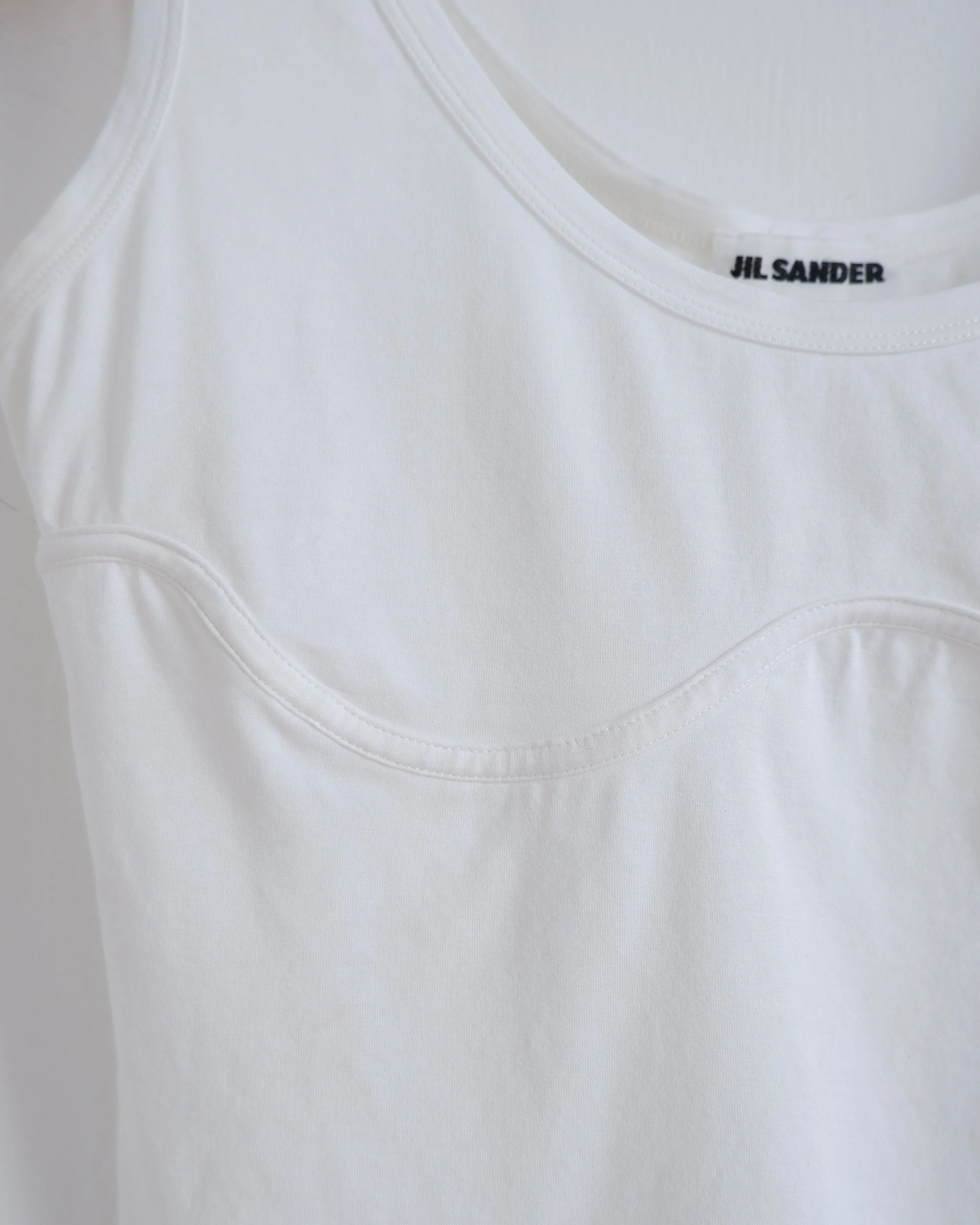 White JIL SANDER tank with seam detail in bra-shape. Bound neckline and armhole. A super soft cotton blend jersey. Colour: White