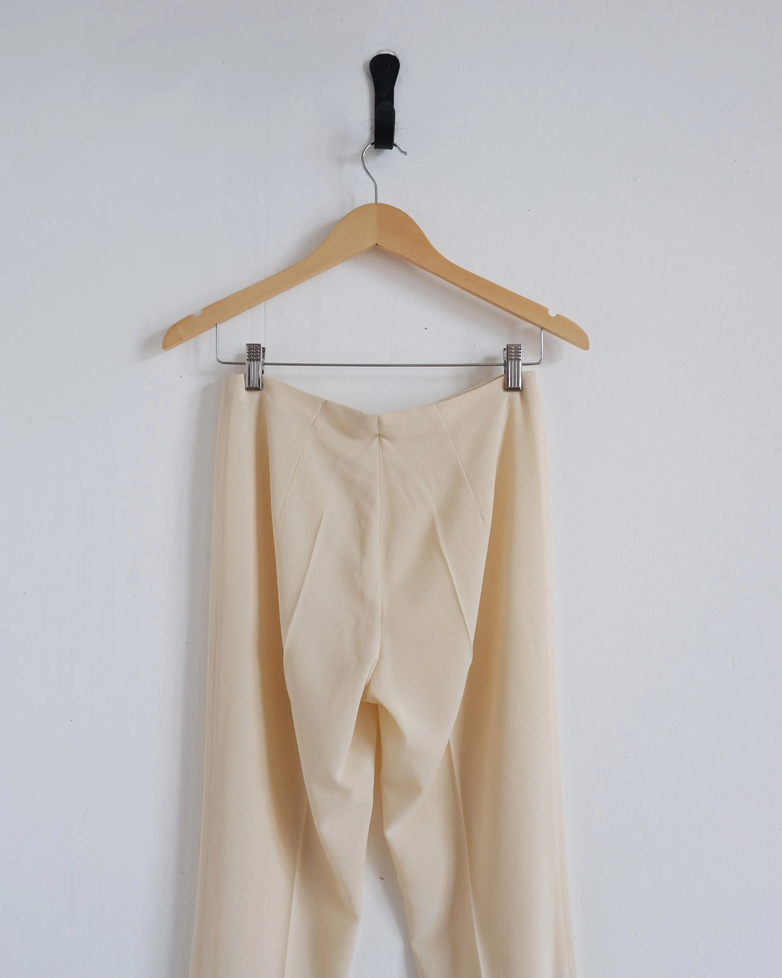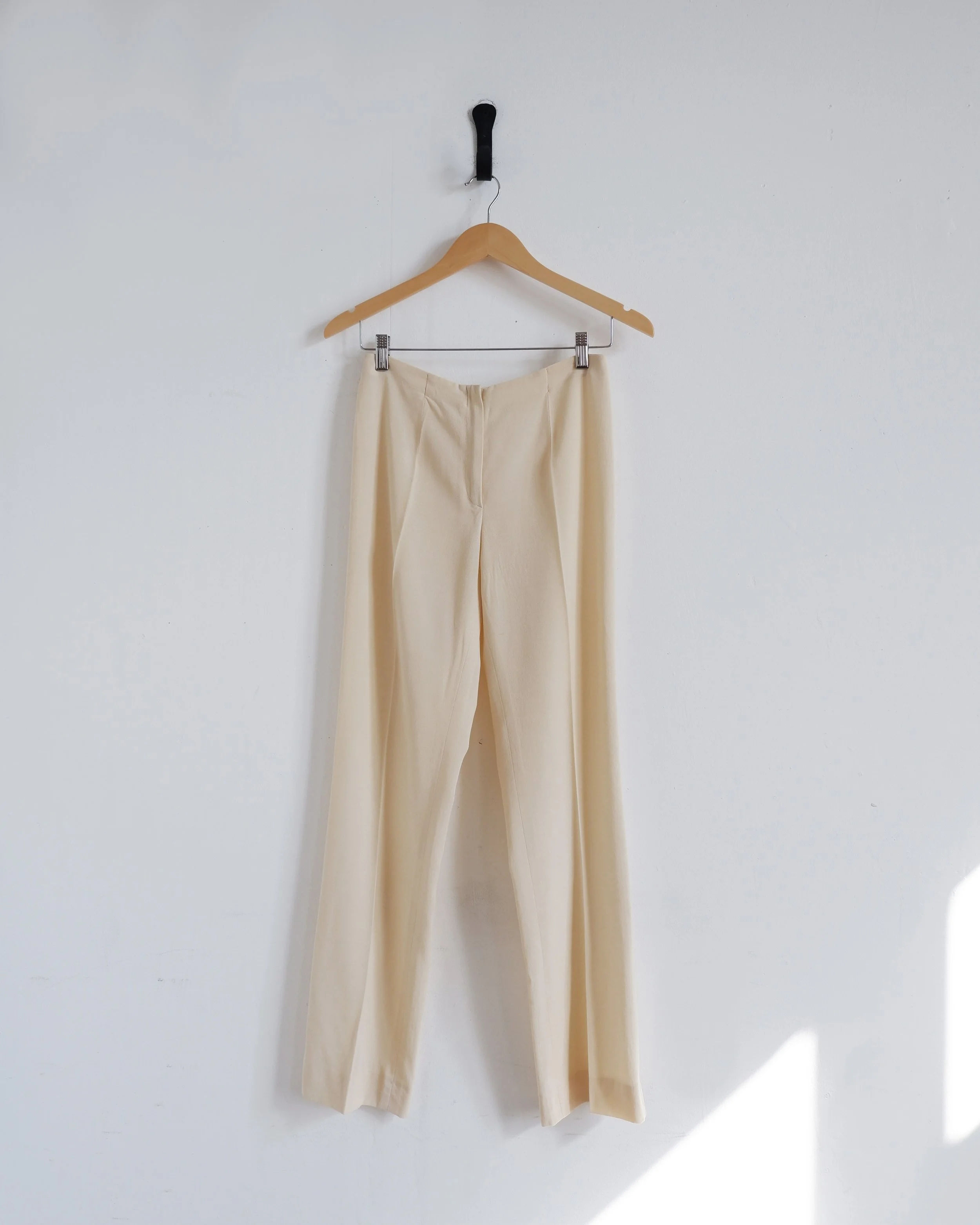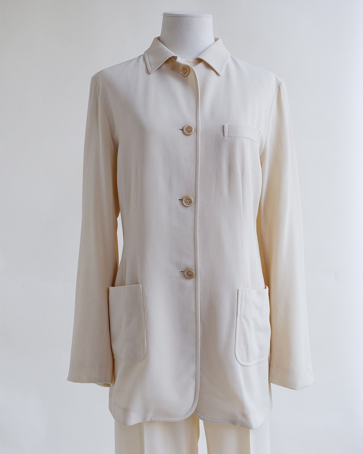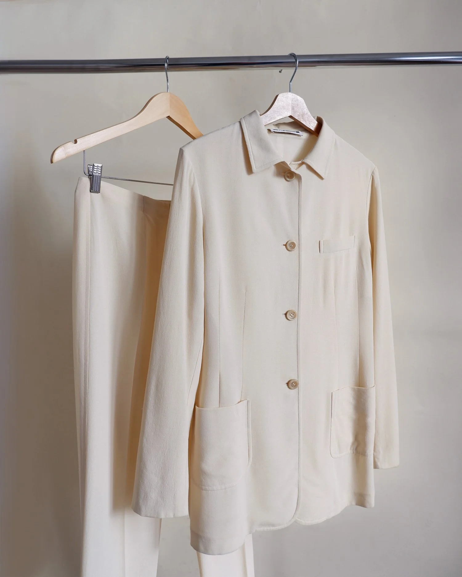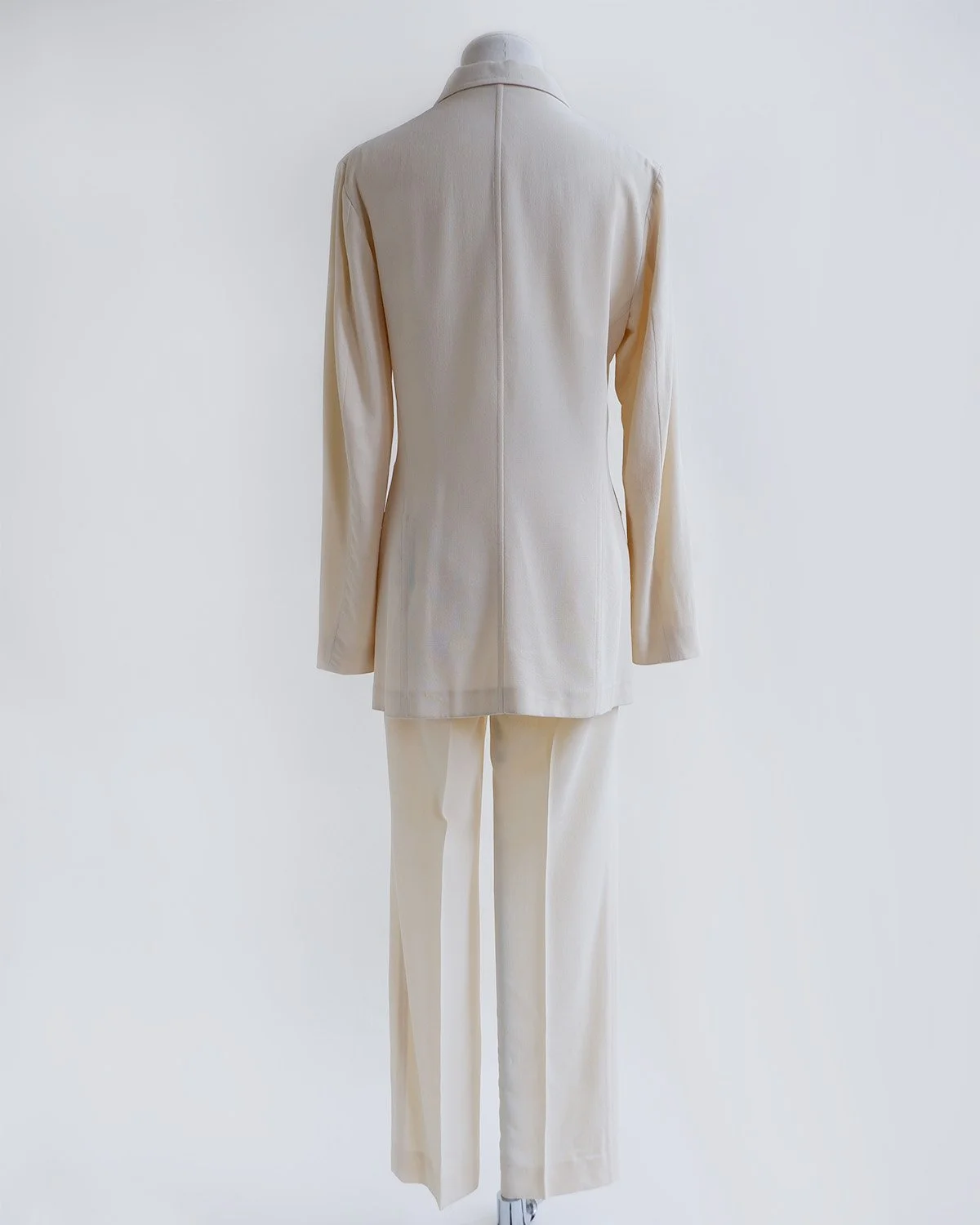 Light wool blend suit from JIL SANDER. Half-lined slim jacket with four button front and three pockets. Completed with mid rise straight cut long trousers. Beautiful dart details. Colour: Ecru