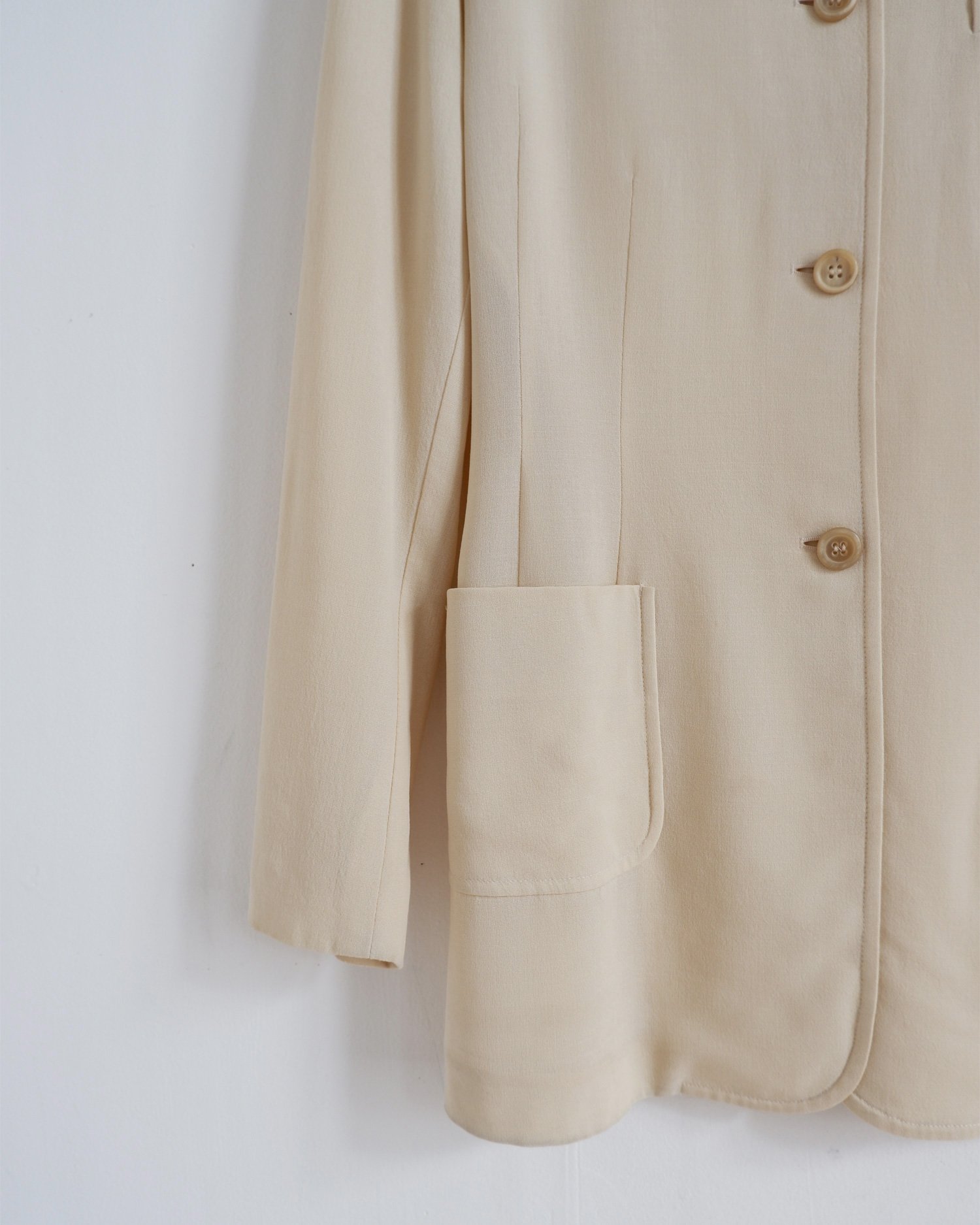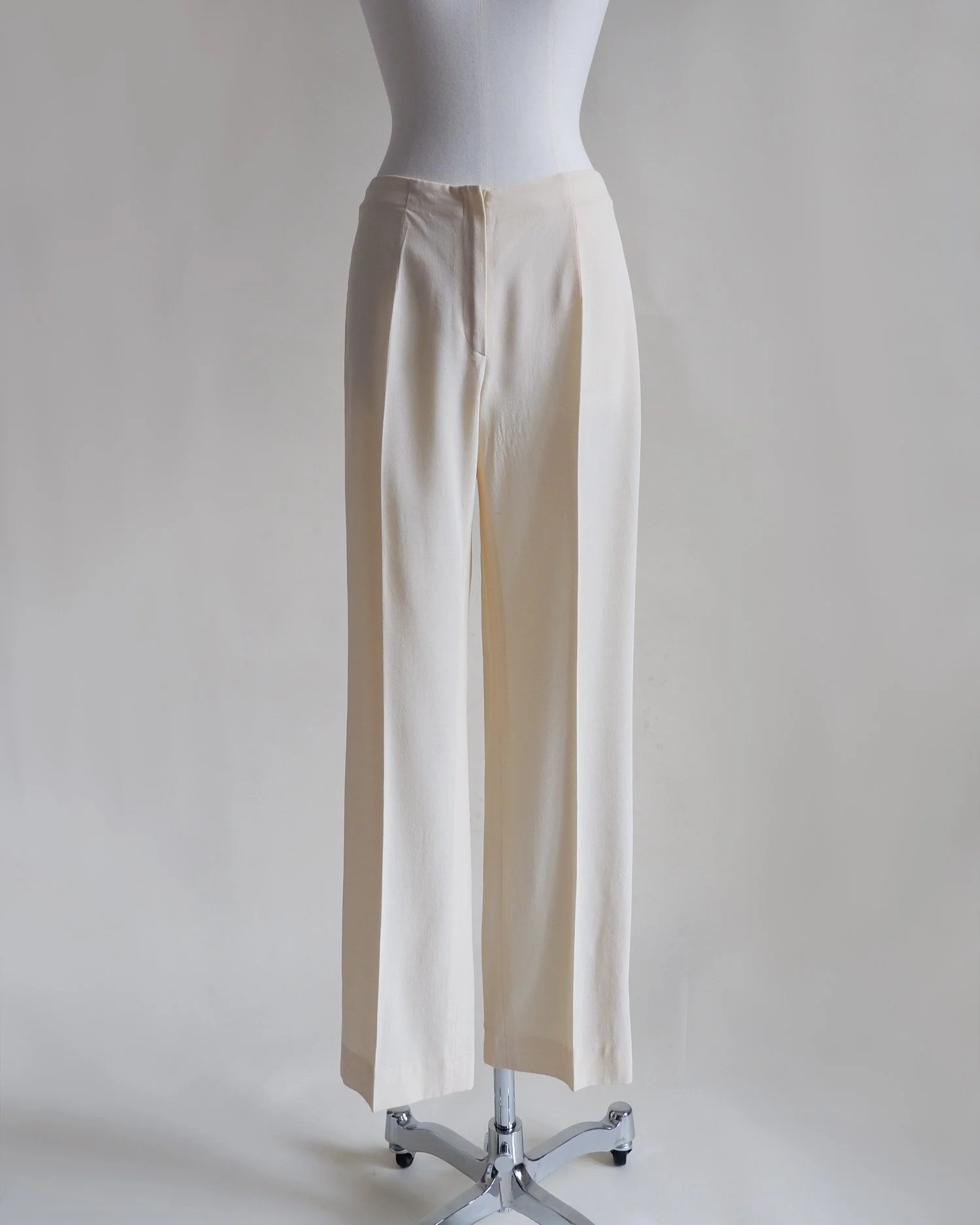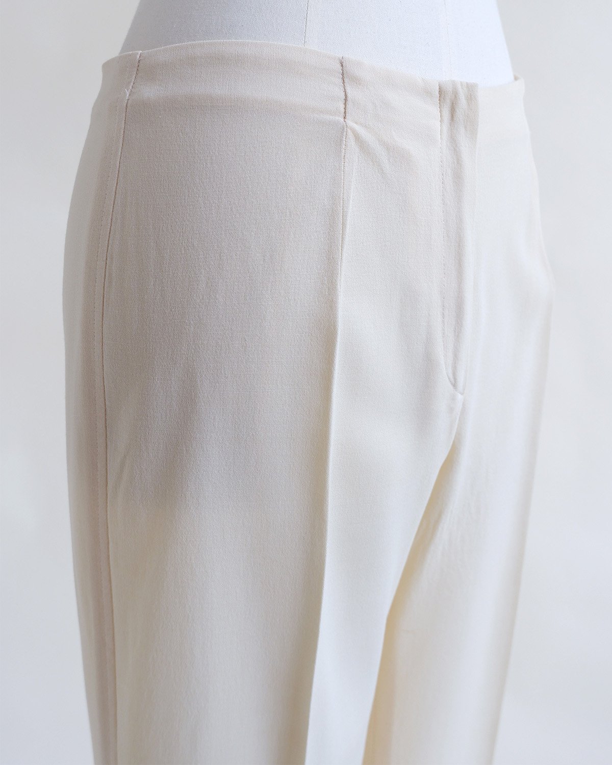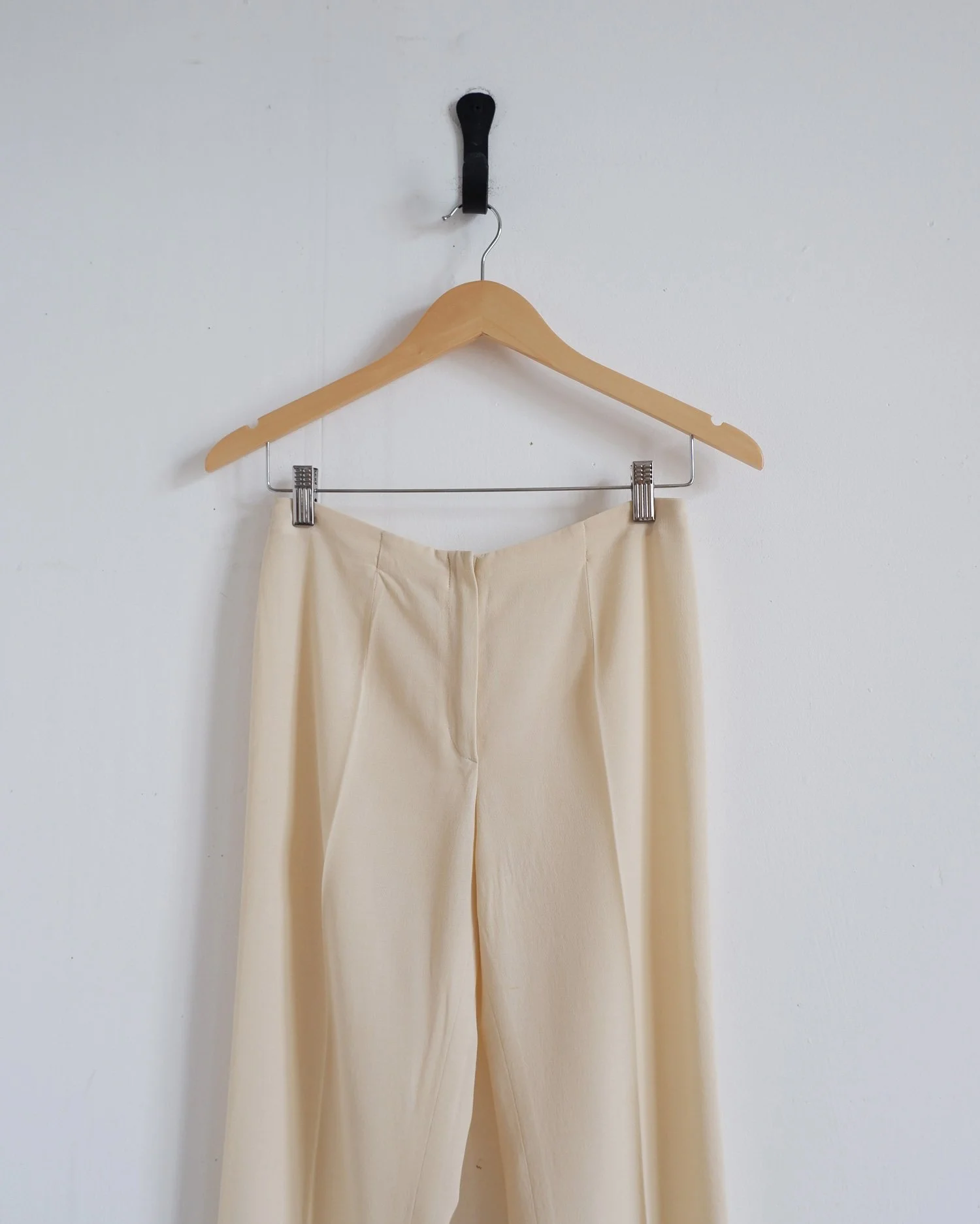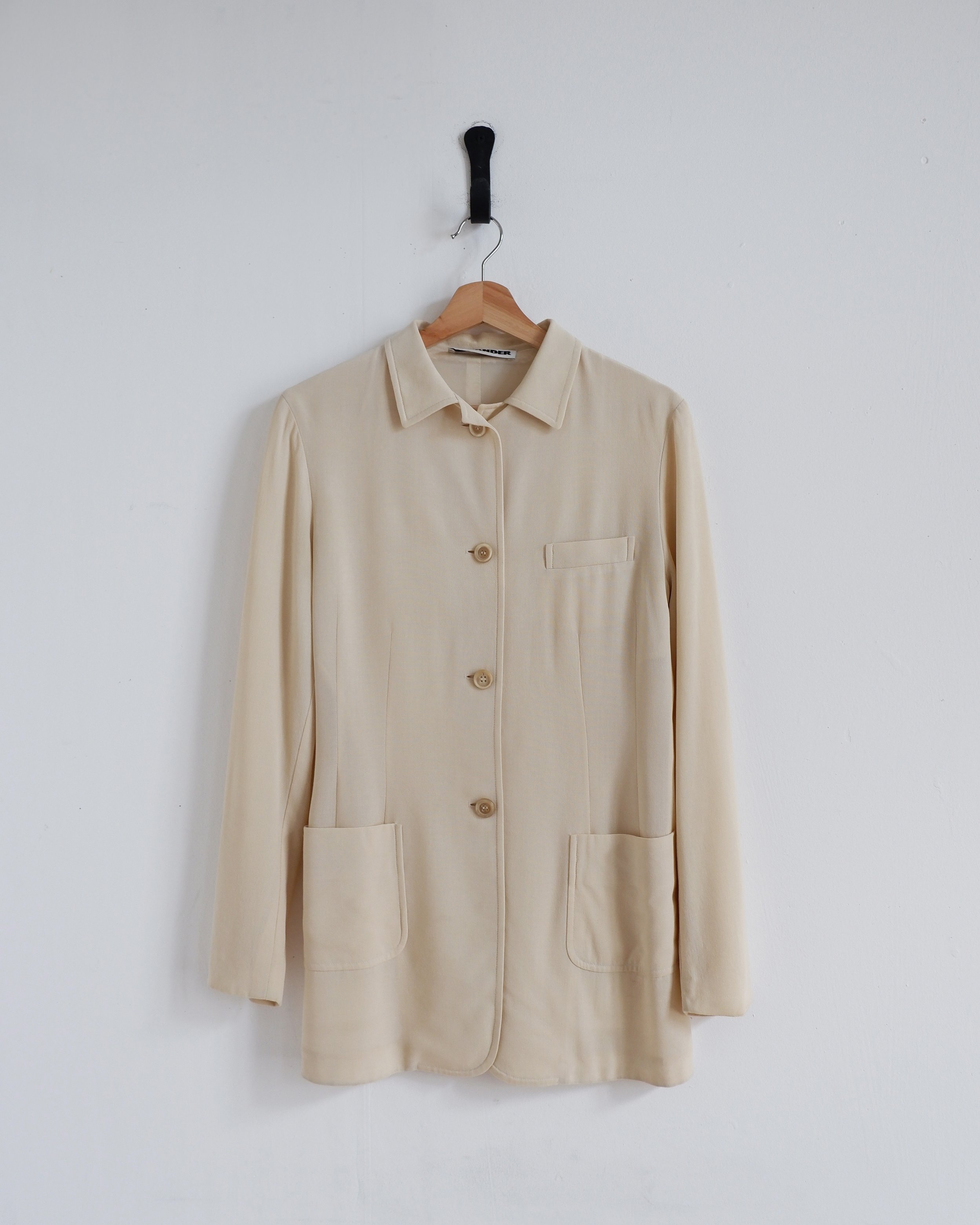 Light wool blend suit from JIL SANDER. Half-lined slim jacket with four button front and three pockets. Completed with mid rise straight cut long trousers. Beautiful dart details. Colour: Ecru