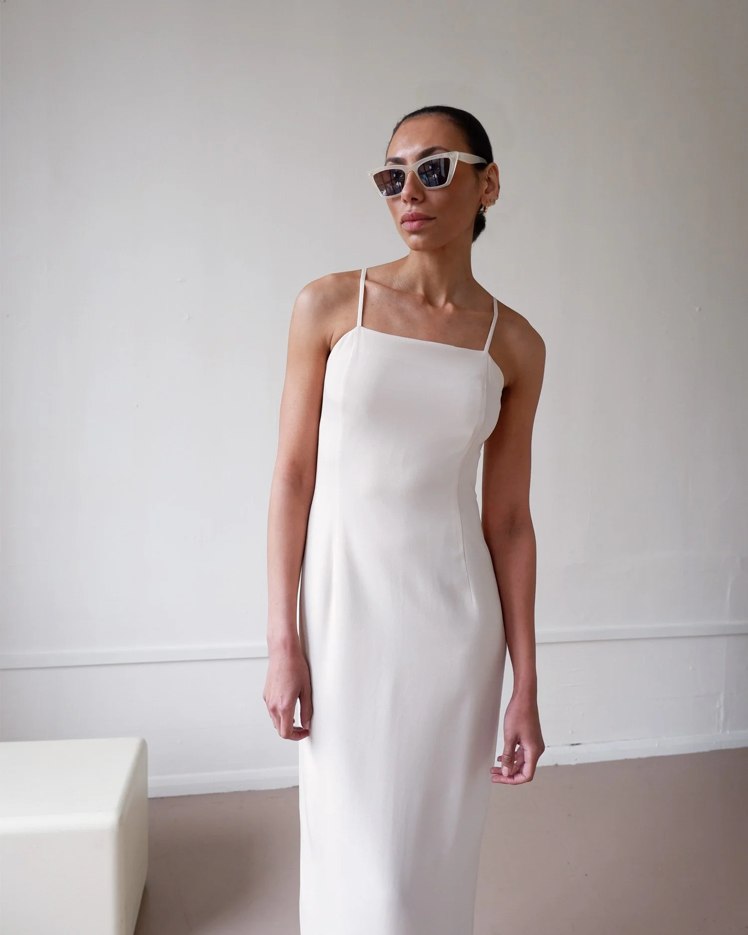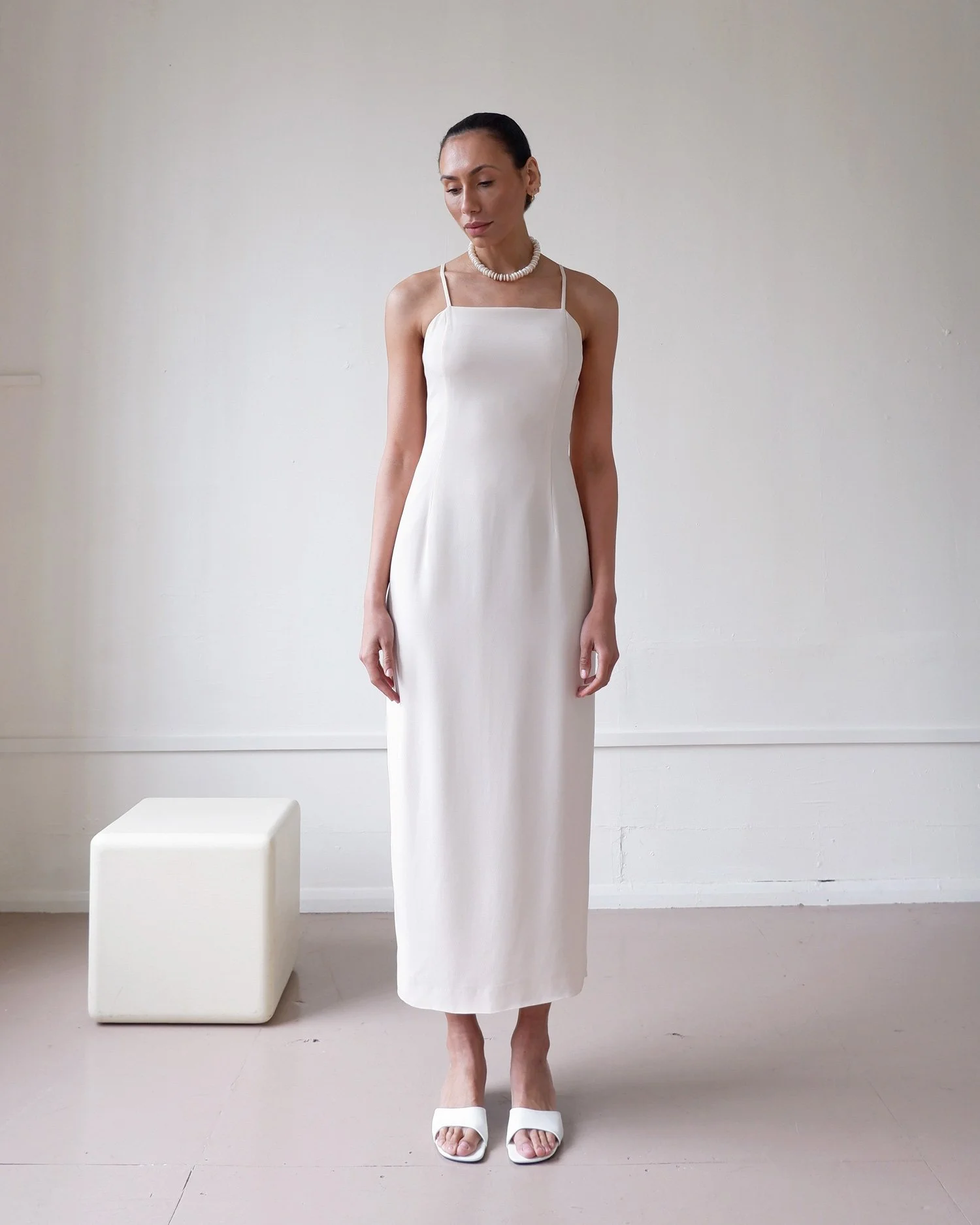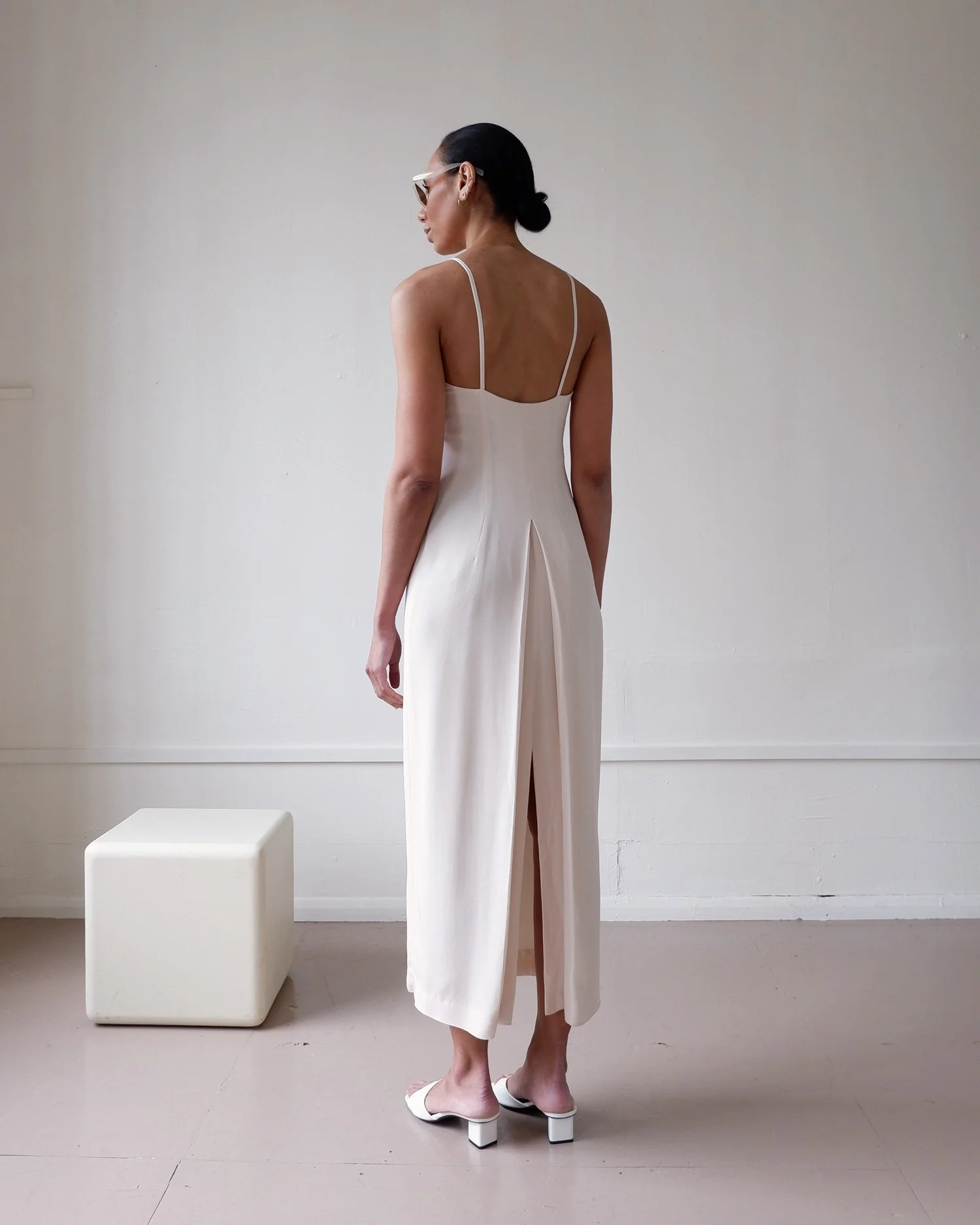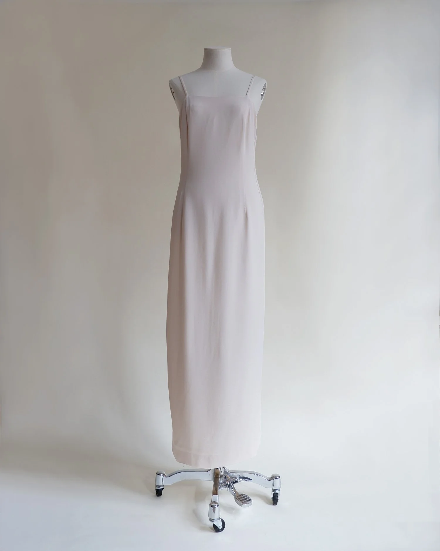 Effortless vintage silk slip dress by Mani. We love the 90’s square neckline and slim straps and the dress is finished with a beautiful inverted pleat split at the back. Maxi length. Side zip closure. Fully lined. Colour - Ivory with subtle blush undertones