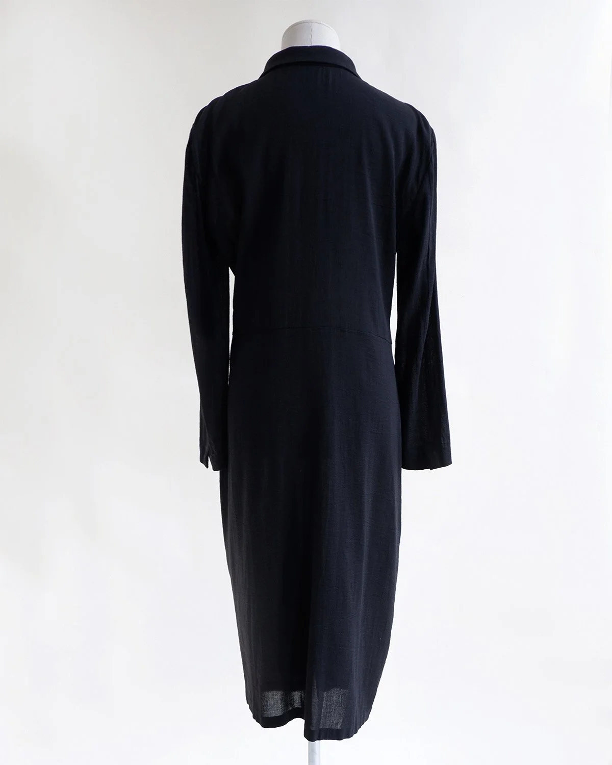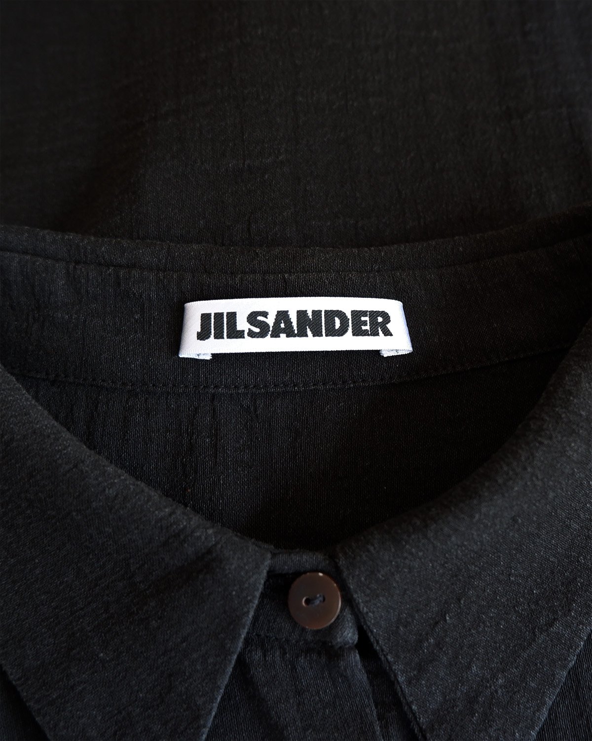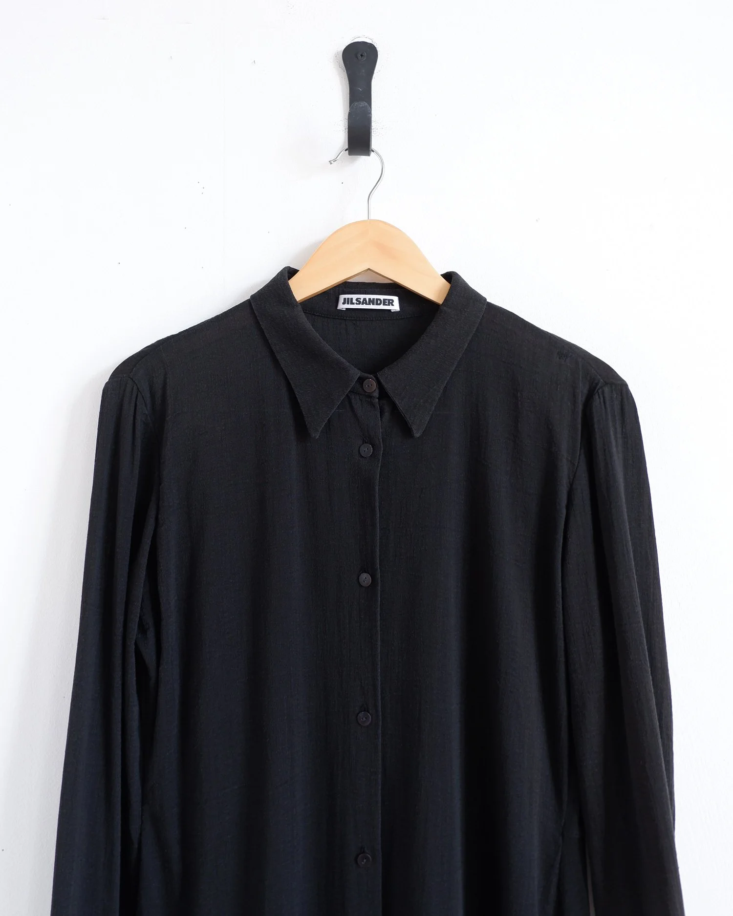 Slightly sheer shirt dress by JIL SANDER. Long sleeved with small slits and seam at back. A naturally crinkled / textured cotton blend fabric. A great layering piece. Colour: Washed black