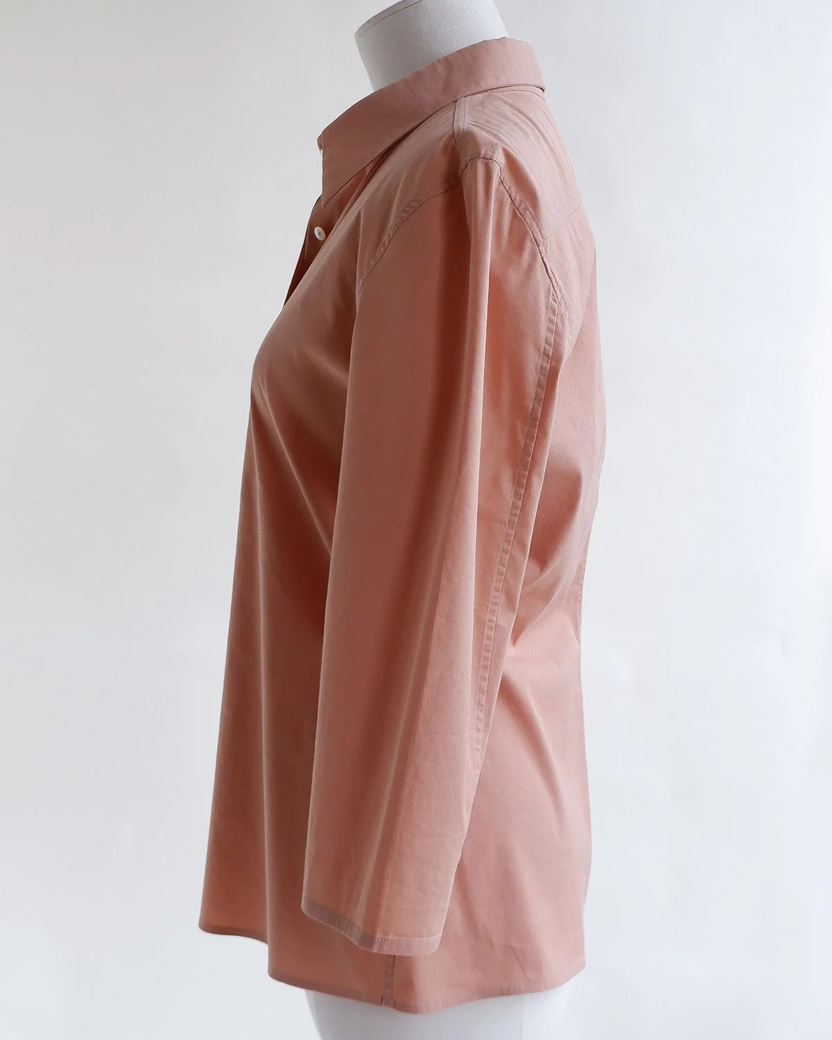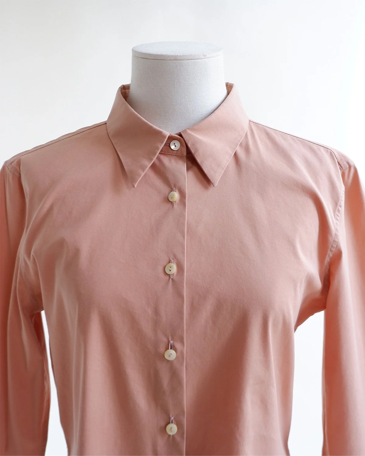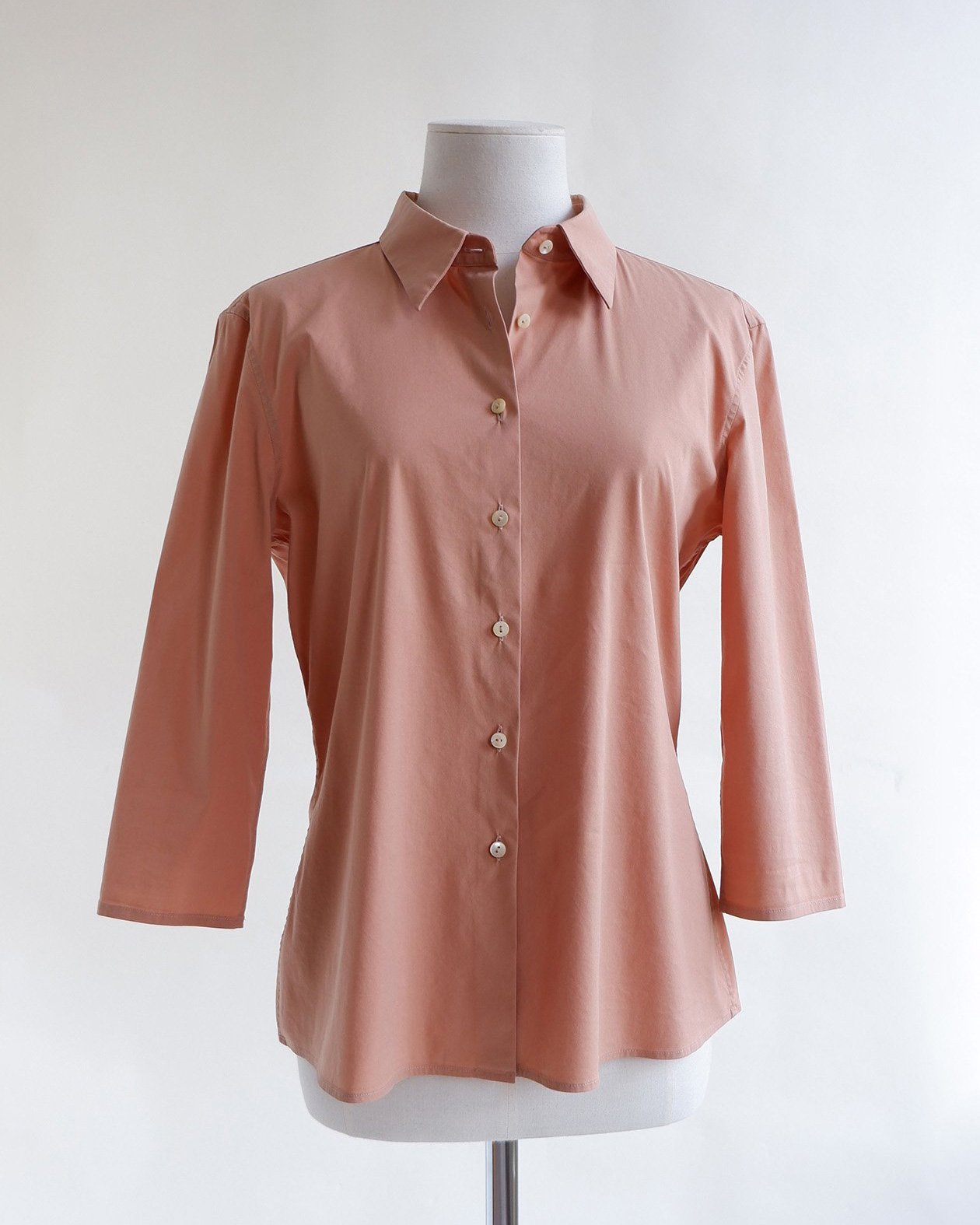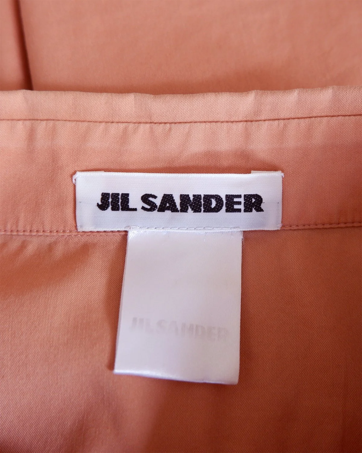 Apricot coloured blouse from JIL SANDER. 3/4 sleeves, fitted cut and minimal mother of pearl buttons. Made of an elastic cotton blend.