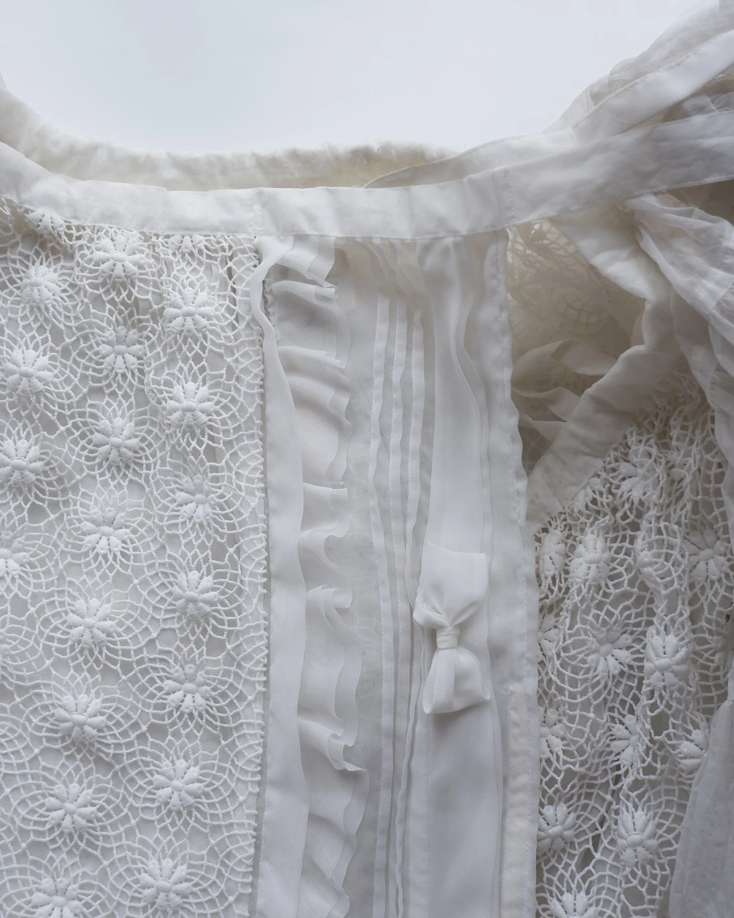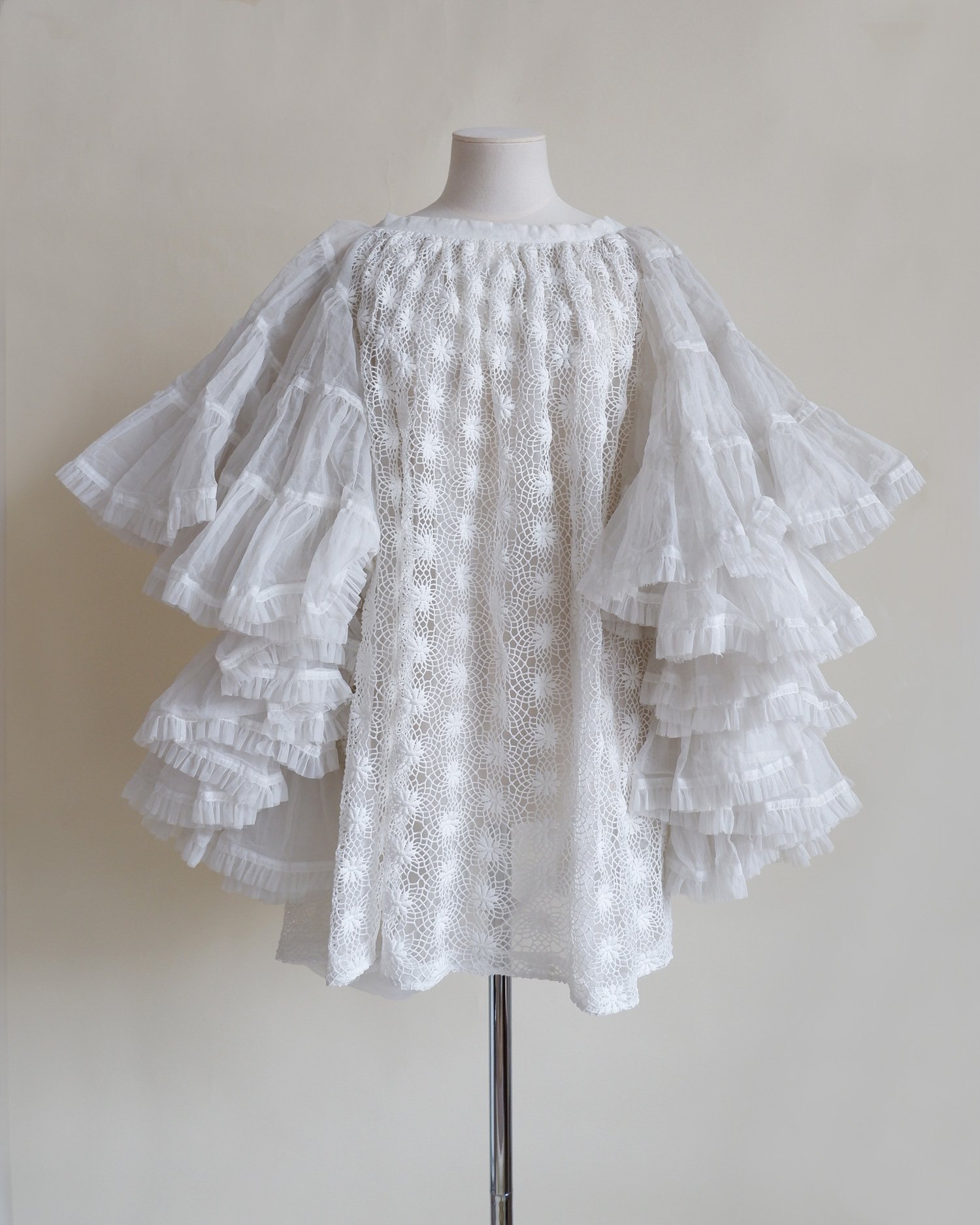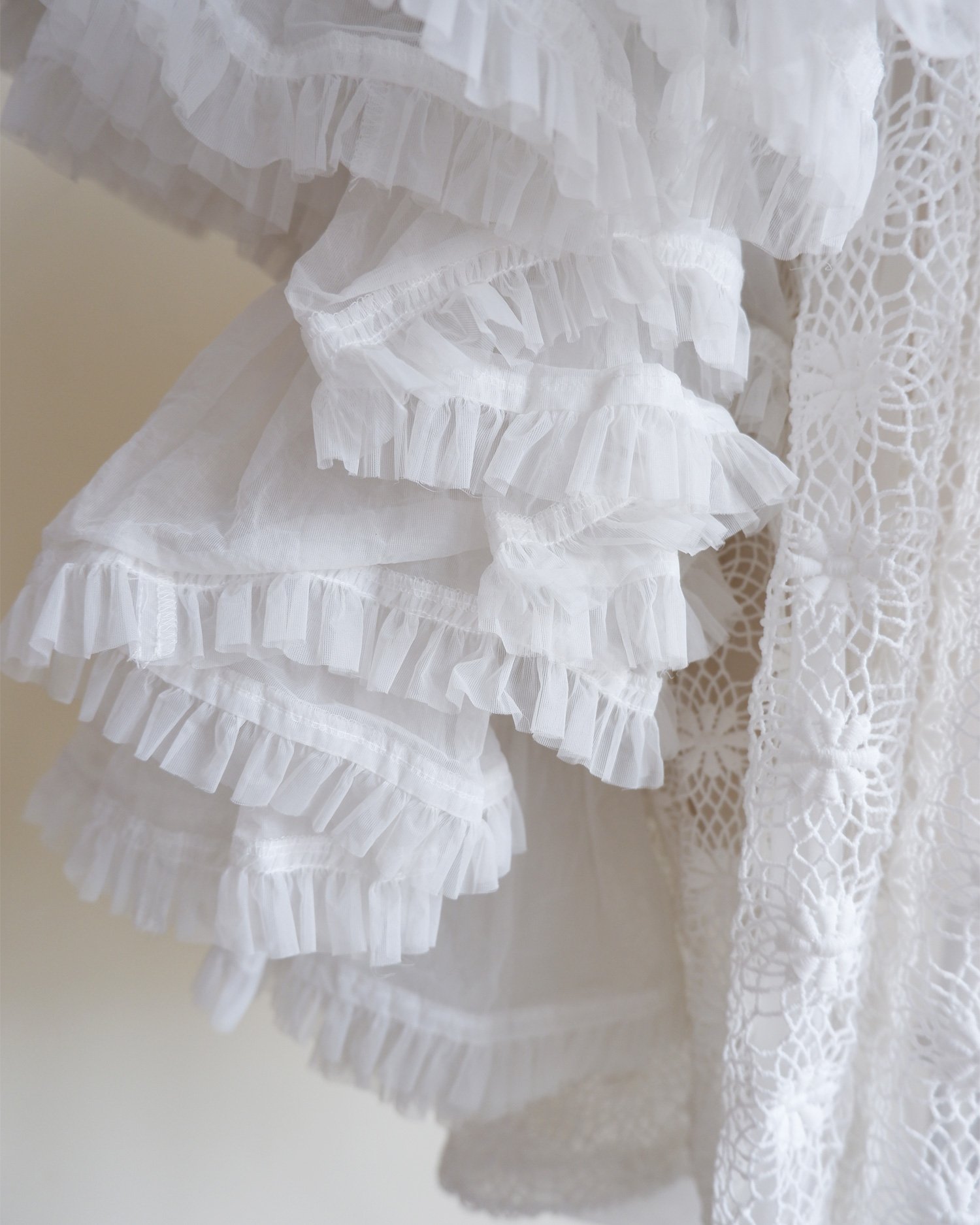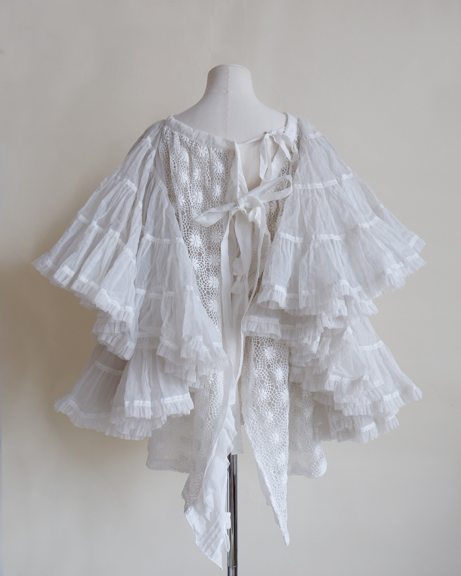 Stunning statement piece by Comme des Garcons. With tiers of tulle ruffles on the sleeves and a main body of intricate lace cut out work. The overcoat ties both internally and on the outside giving the wearer multiple ways to wear whether back to front or vice versa. So much attention to detail and we love the pleated panel to one side that is decorated with bows. Fully lined. Colour - white. Original RRP £1200.