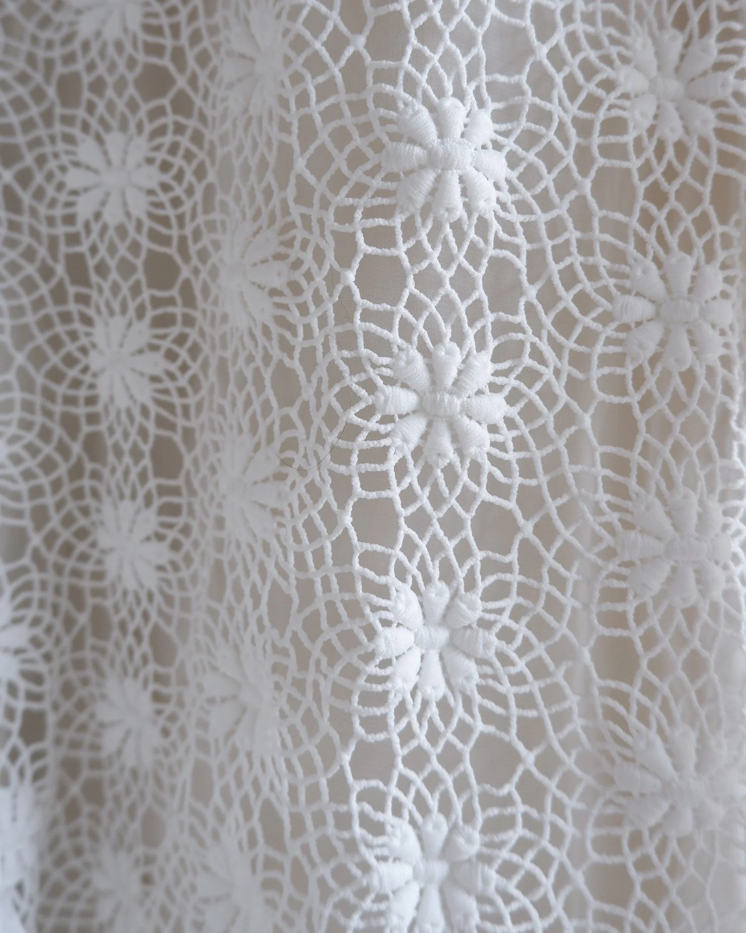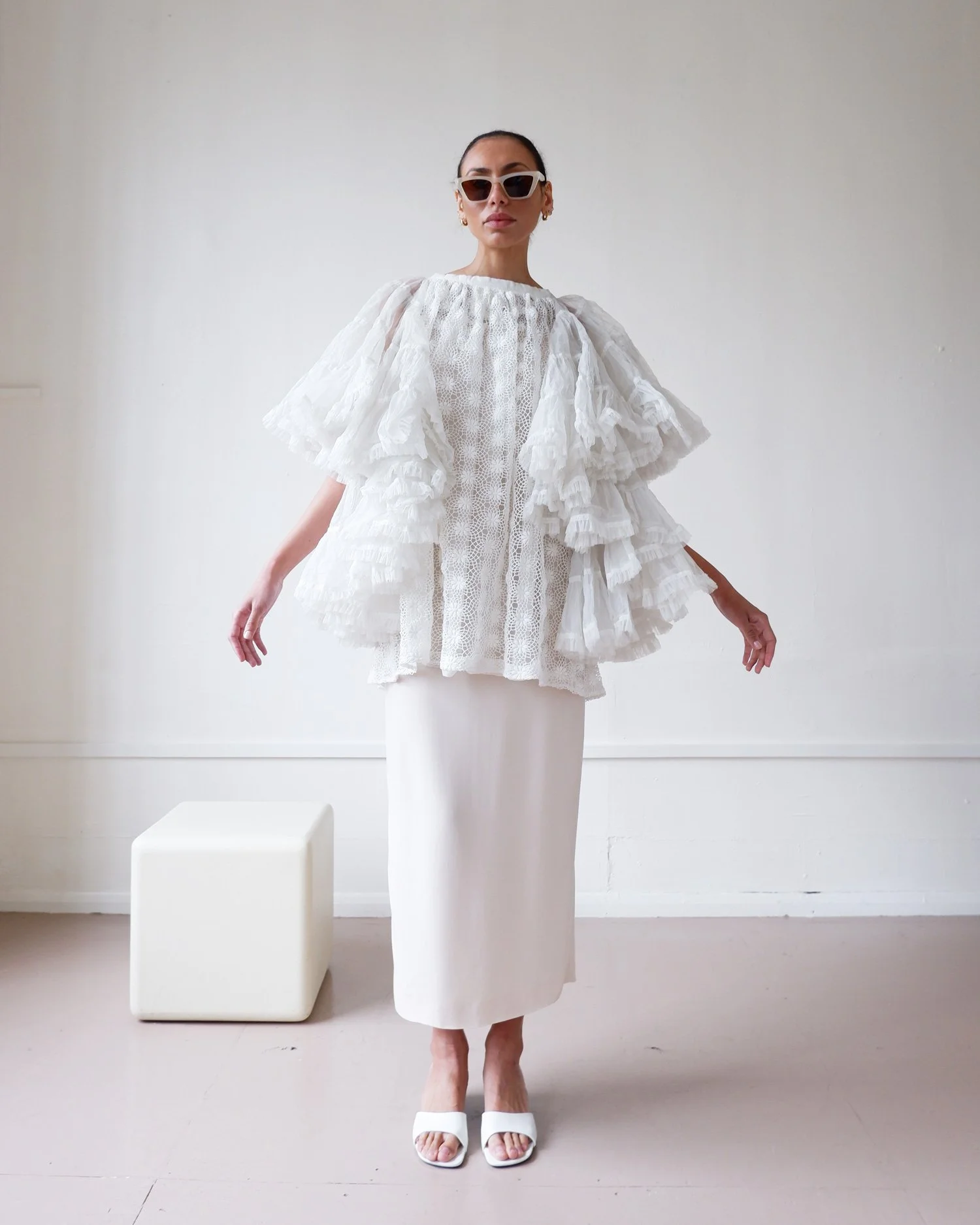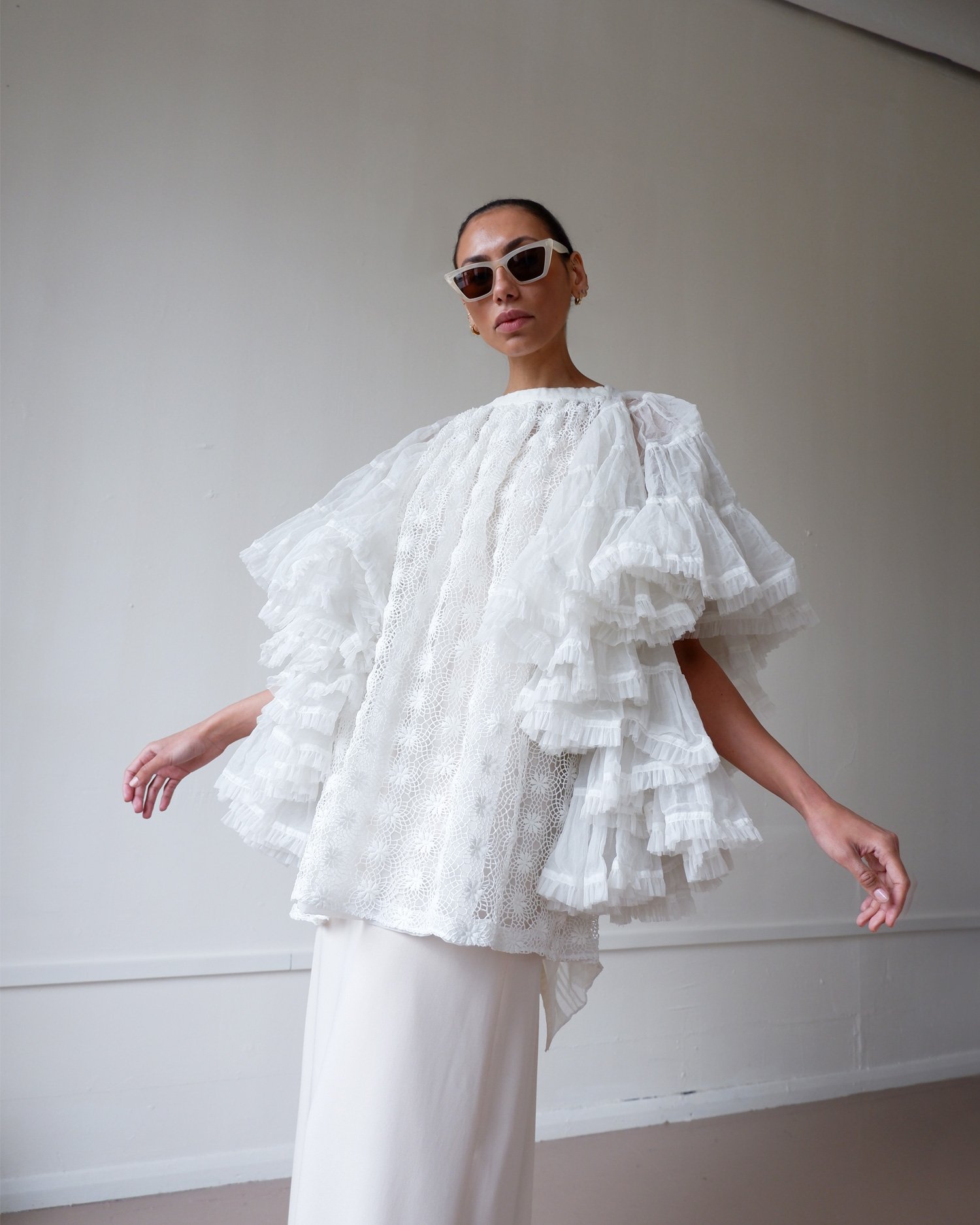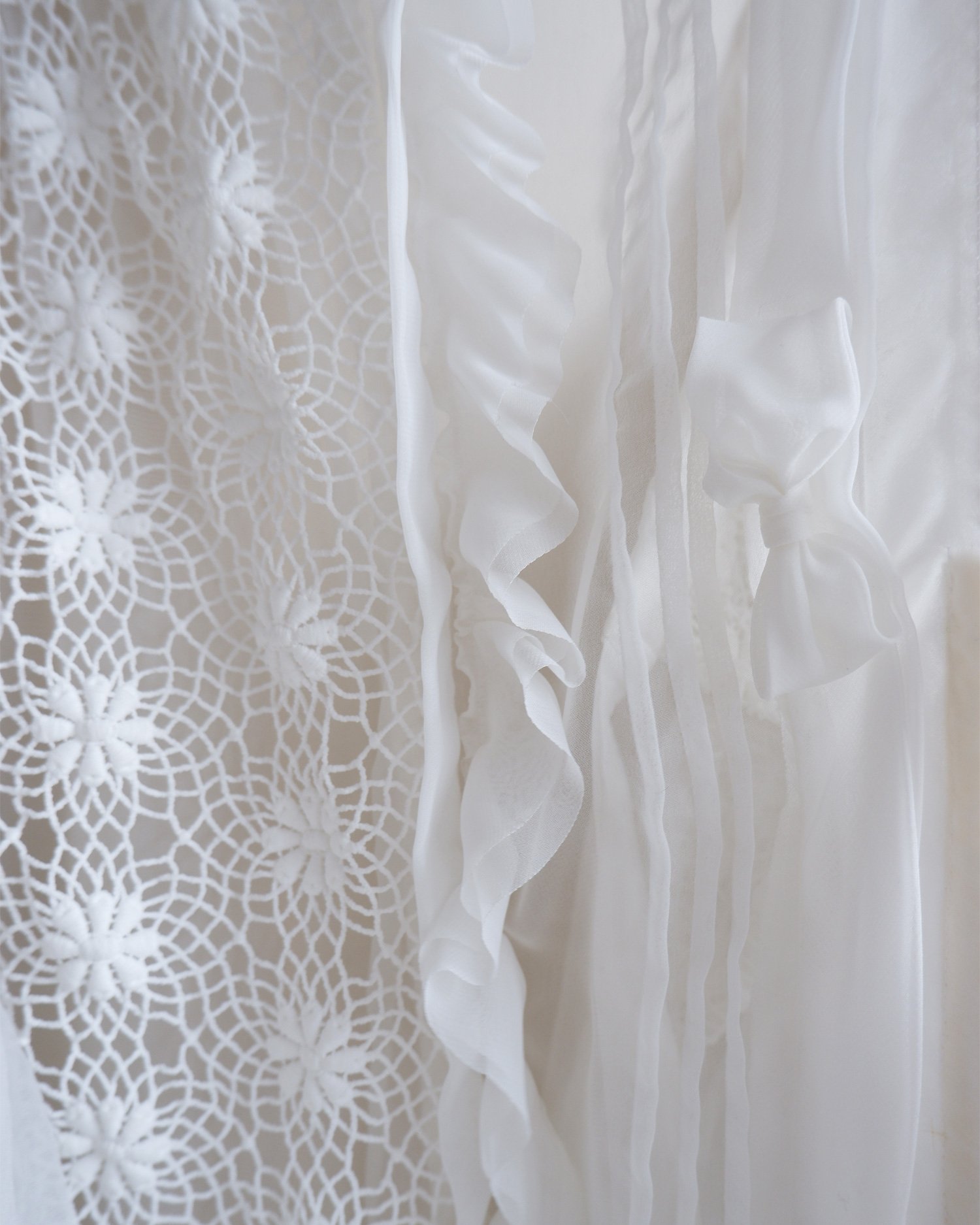 Stunning statement piece by Comme des Garcons. With tiers of tulle ruffles on the sleeves and a main body of intricate lace cut out work. The overcoat ties both internally and on the outside giving the wearer multiple ways to wear whether back to front or vice versa. So much attention to detail and we love the pleated panel to one side that is decorated with bows. Fully lined. Colour - white. Original RRP £1200.