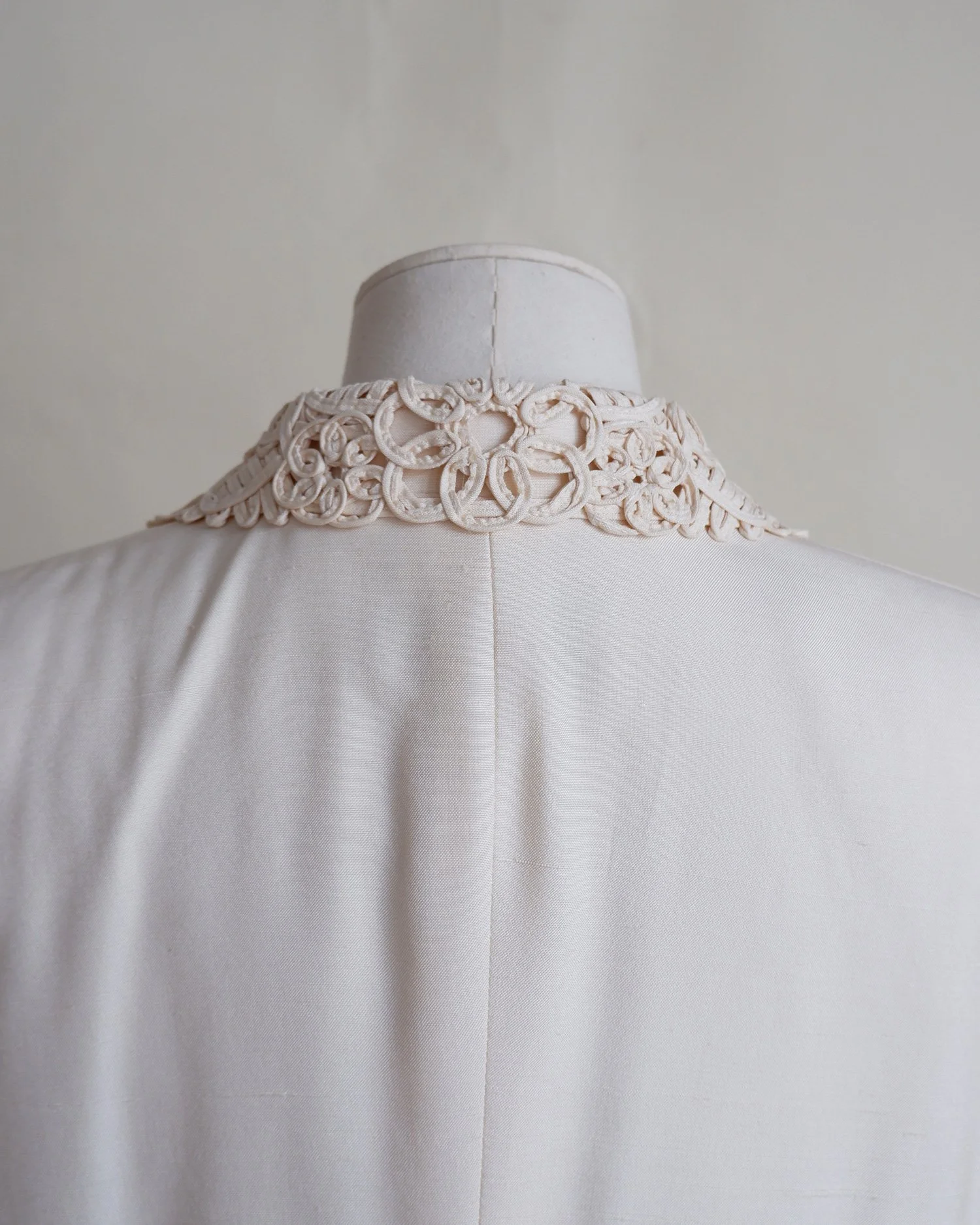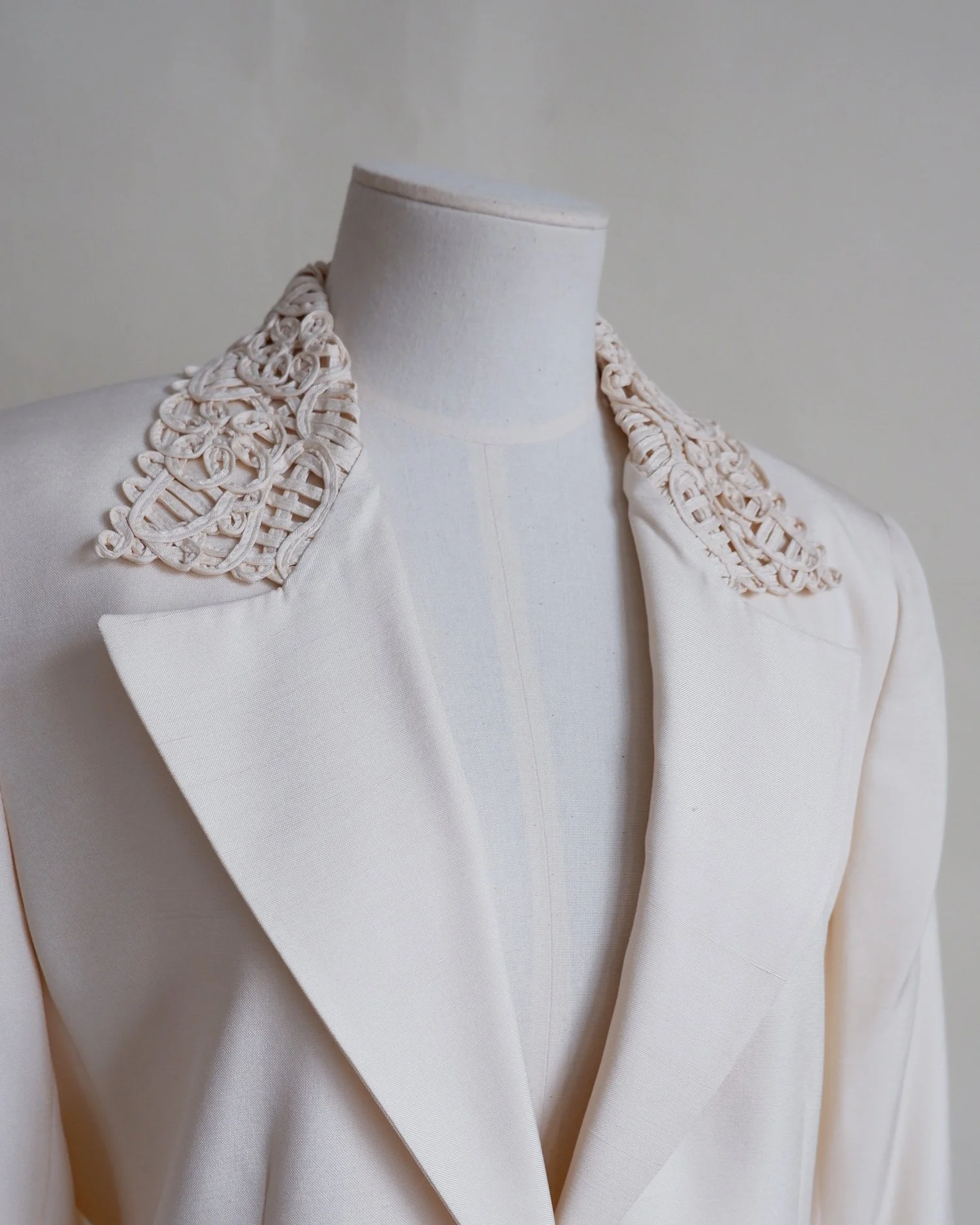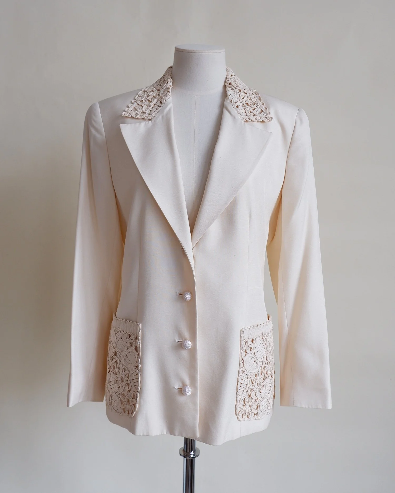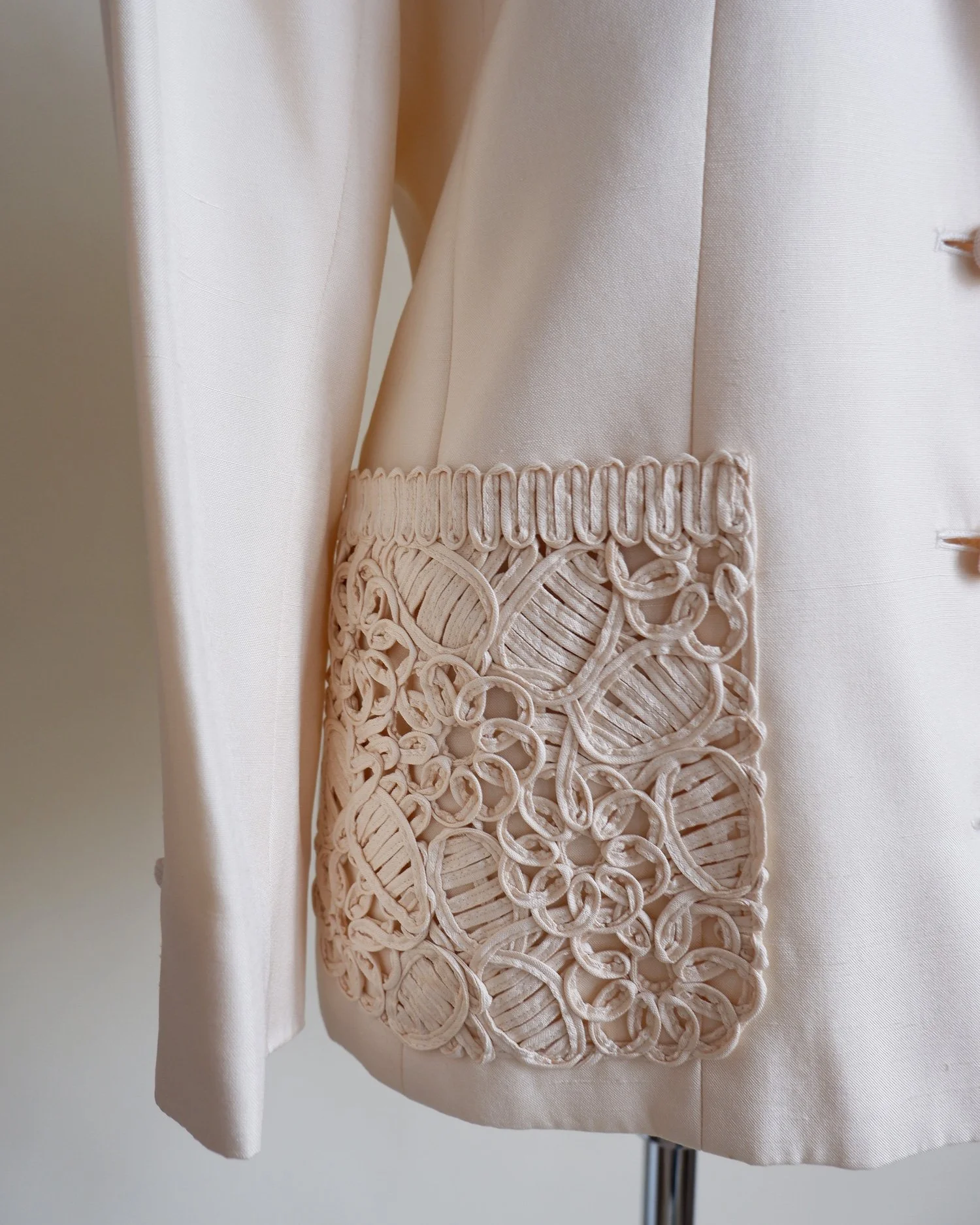 Vintage silk blazer by Valentino Miss V. Single breasted with beautiful corded buttons and lightly padded shoulders for subtle definition. We love the intricate applique detail across the pockets and collar which really elevate the piece to a whole new level. 100% silk in a champagne hue.