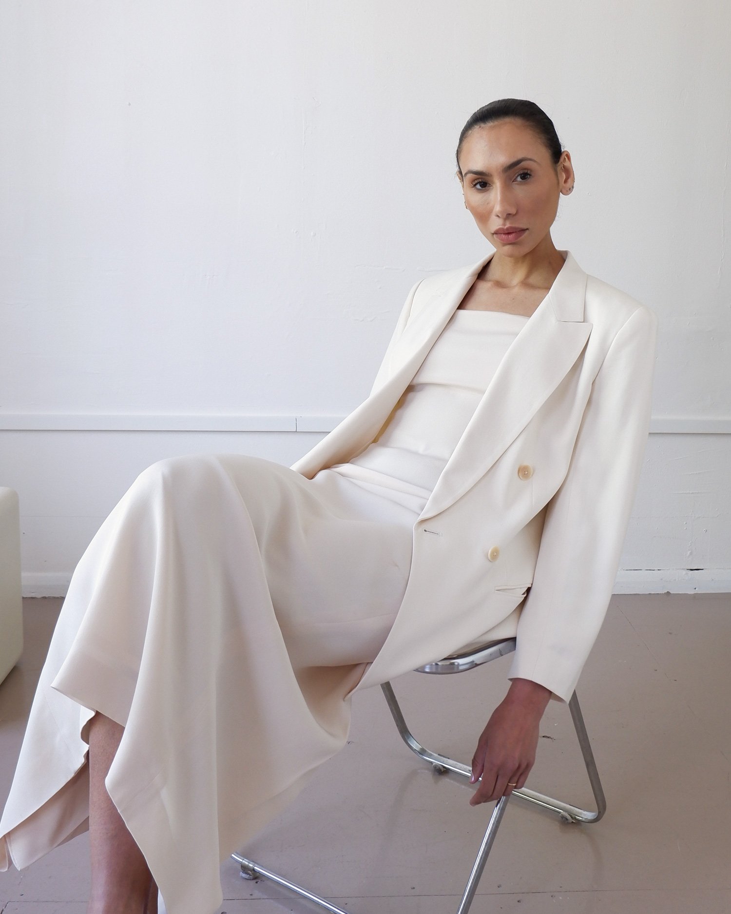 Vintage 90’s silk blazer. Double breasted with tonal buttons, welt pockets and lightly padded shoulders for subtle definition. Long-line which makes it a great layering piece. 100% soft matt silk in ivory.