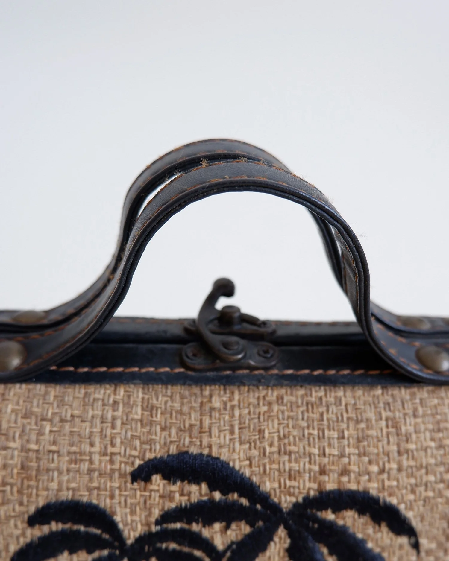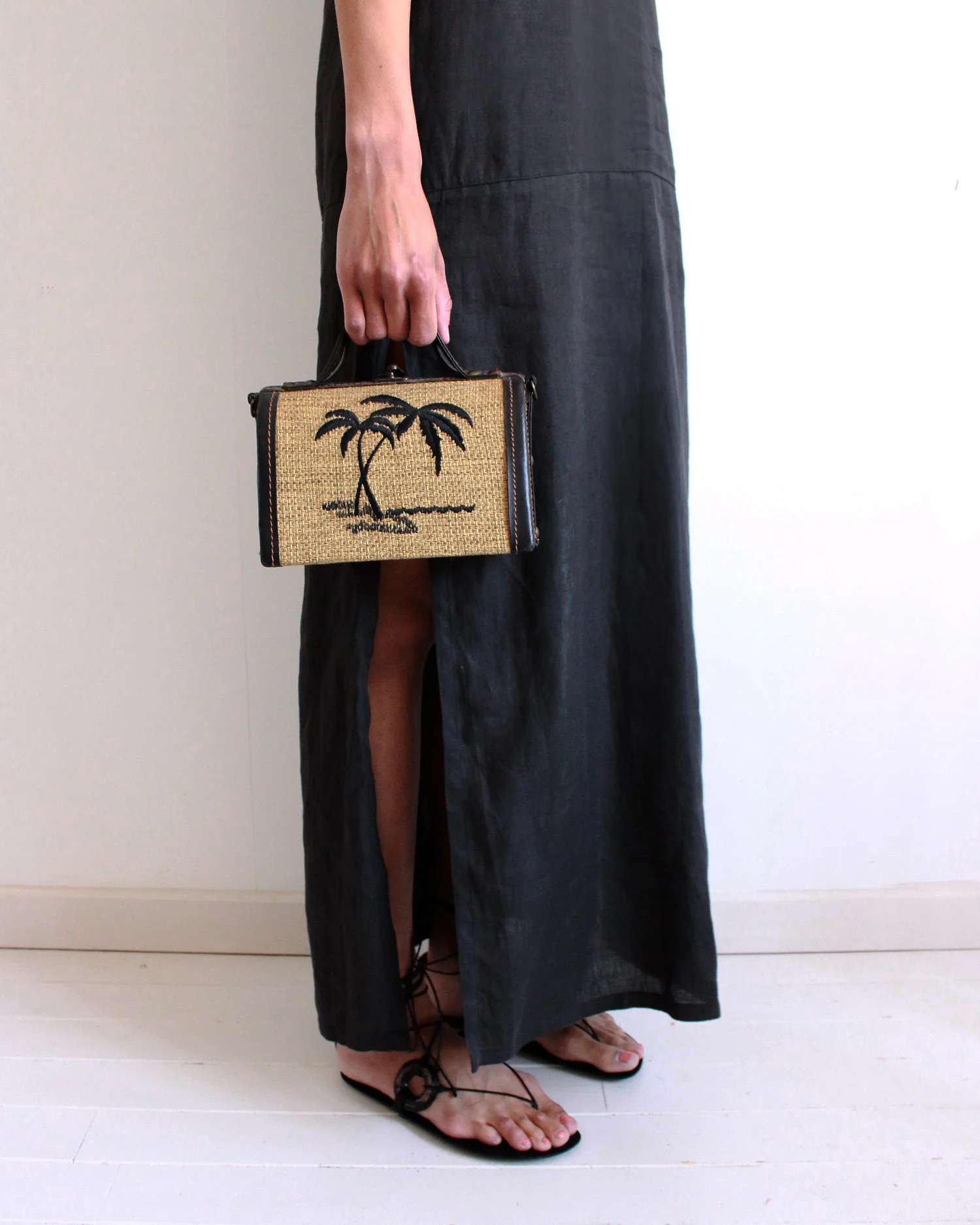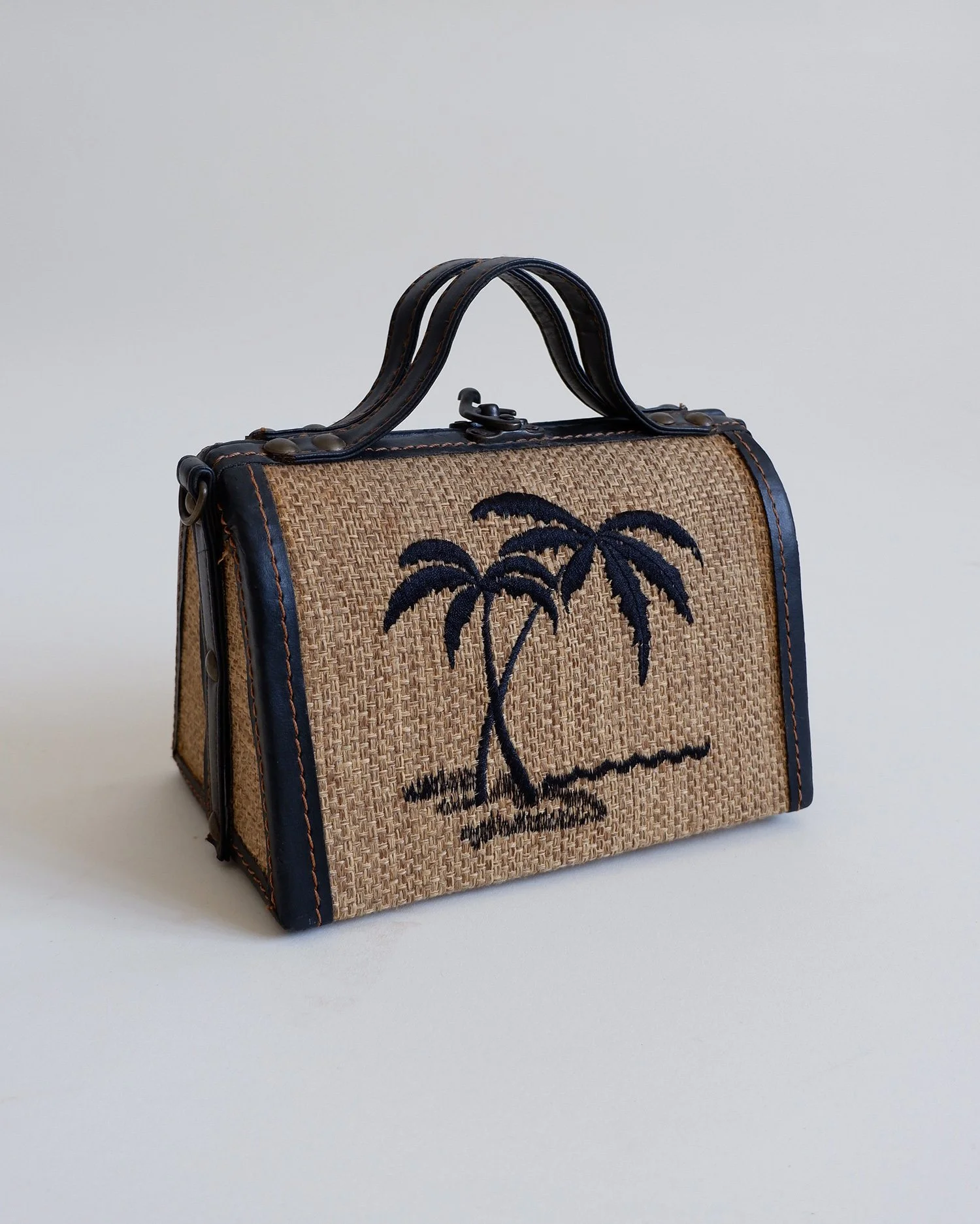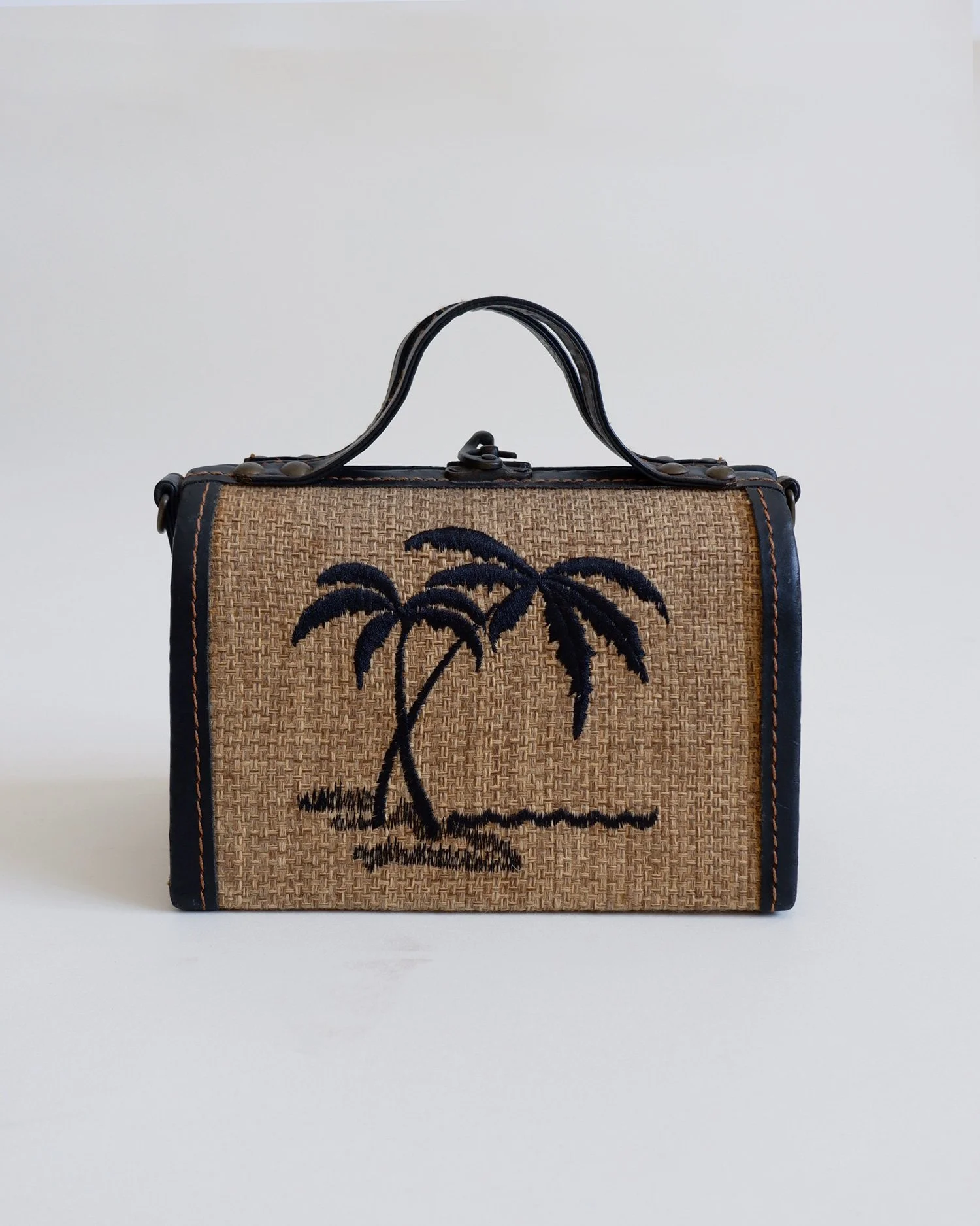Stunning vintage top handle bag with a lovely woven raffia base with embroidered palm tree motifs. Leather trims and handle with contrast stitching. Hard case. Fully lined. No interior pockets. A truly special and unique piece.